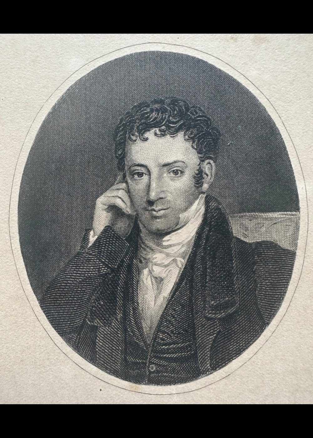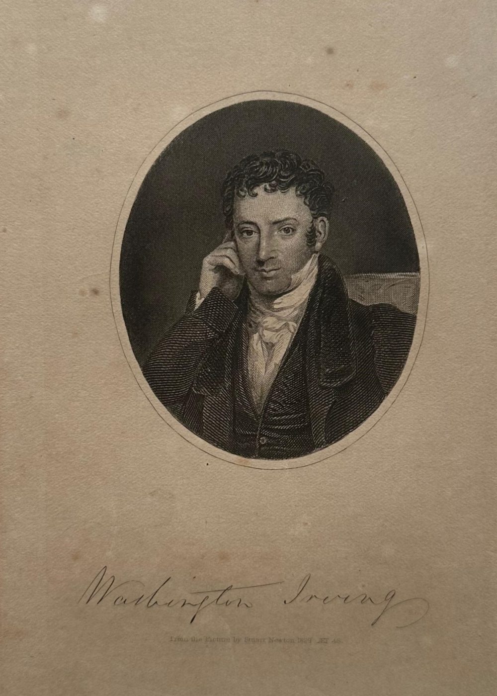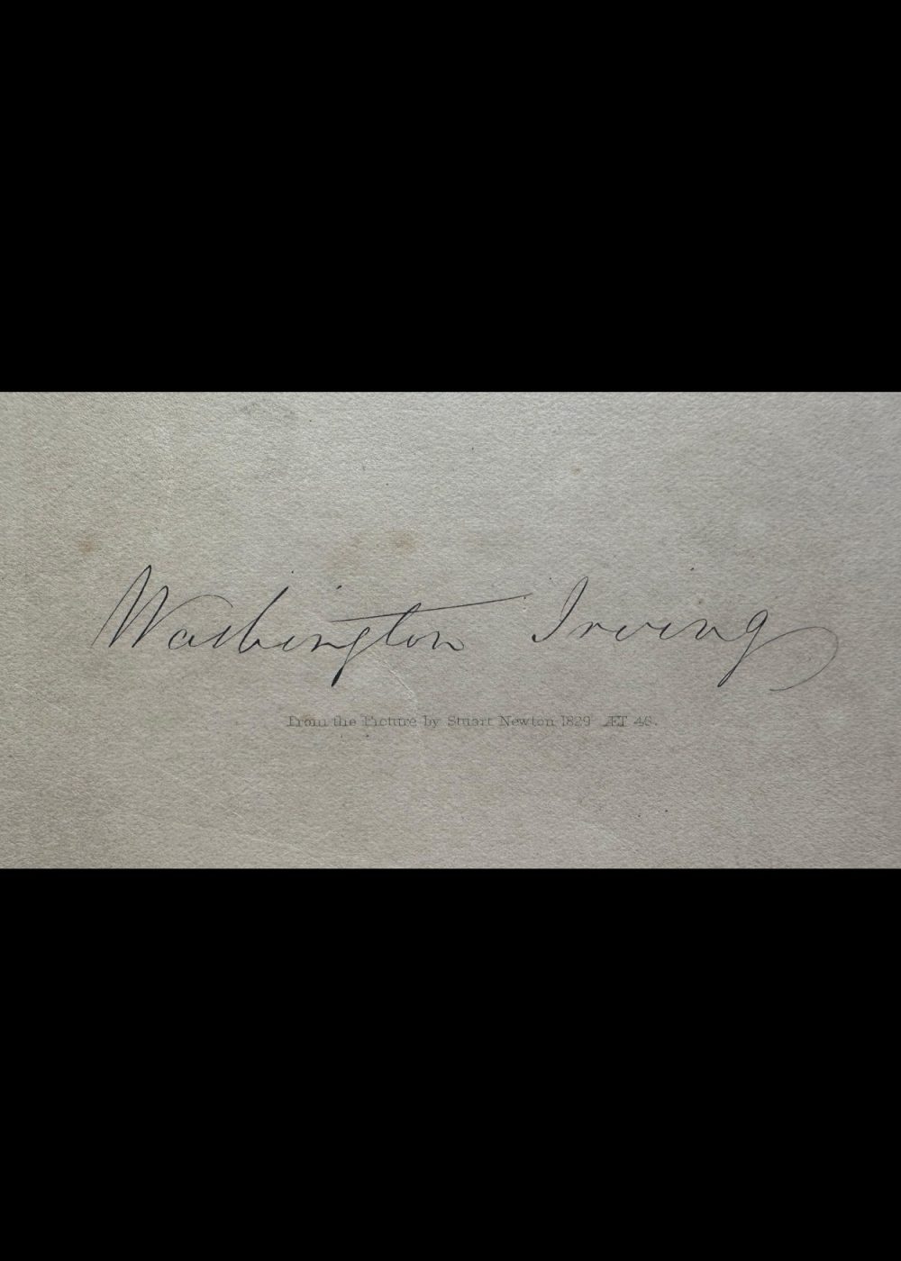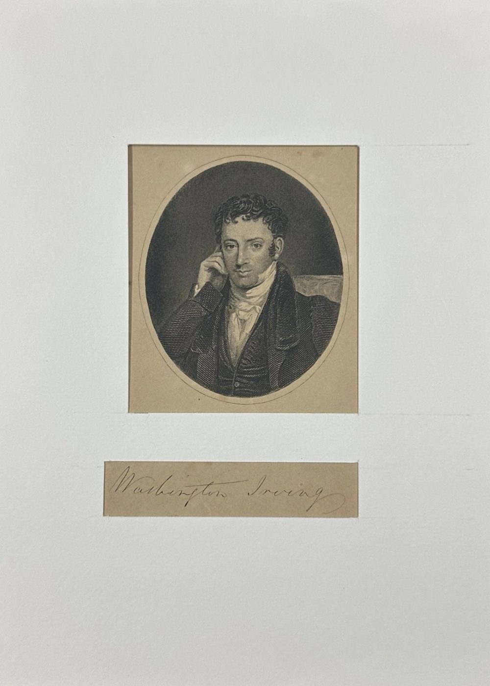 This is an engraved portrait of Washington Irving, the renowned American author best known for works such as The Legend of Sleepy Hollow and Rip Van Winkle. The image shows Irving seated in a contemplative pose, resting his head on one hand, dressed in early 19th-century attire. The engraving is finely detailed, framed in an oval, and beneath it is his name inscribed in elegant script. A note below the portrait indicates it was based on a painting by Stuart Newton, Esq. R.A.