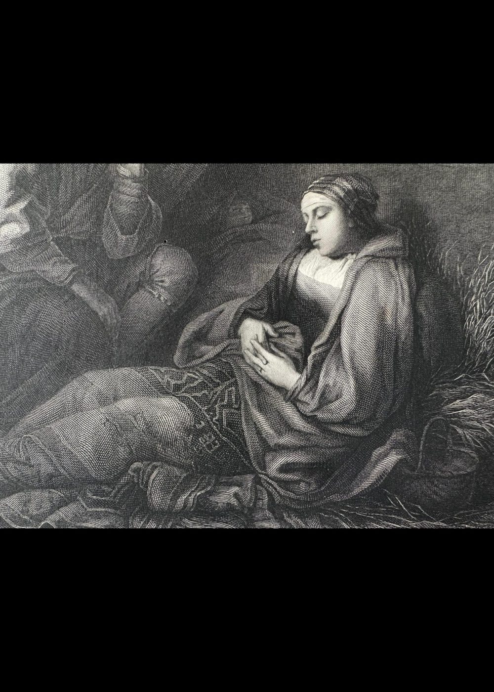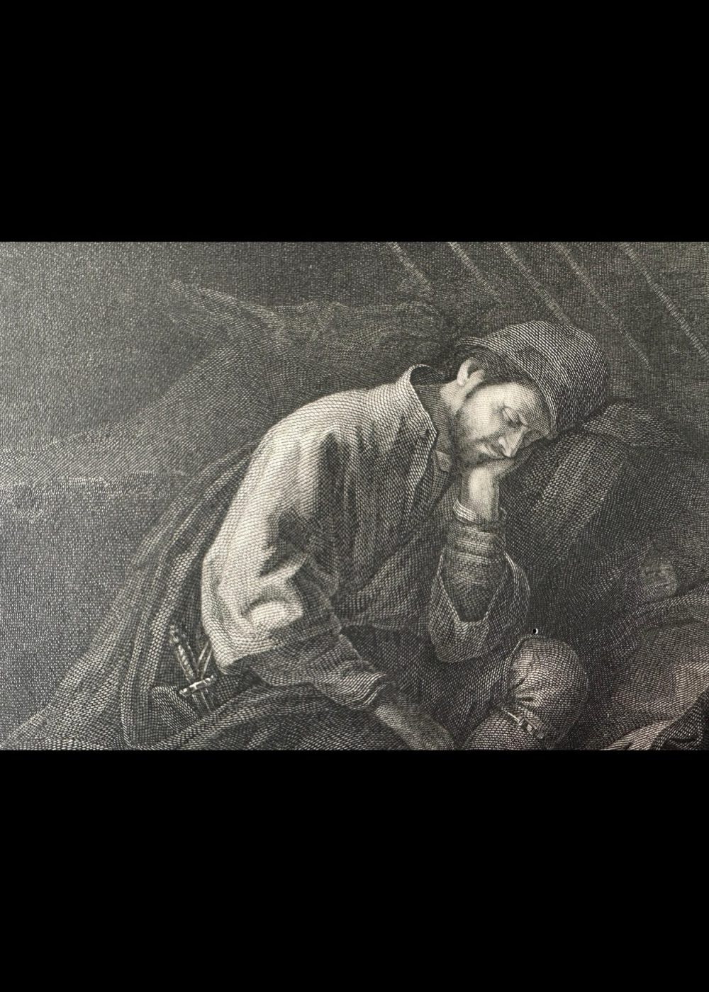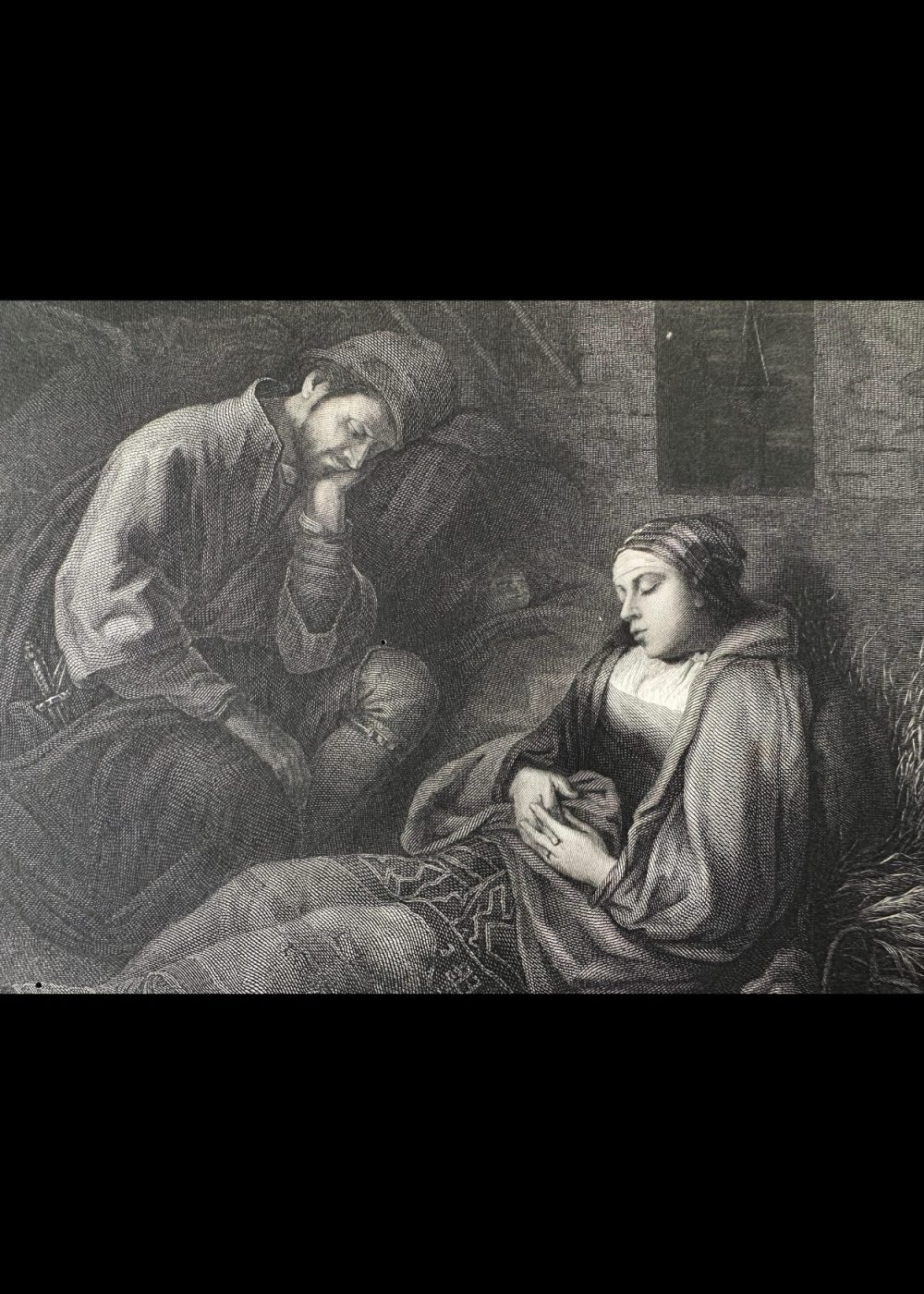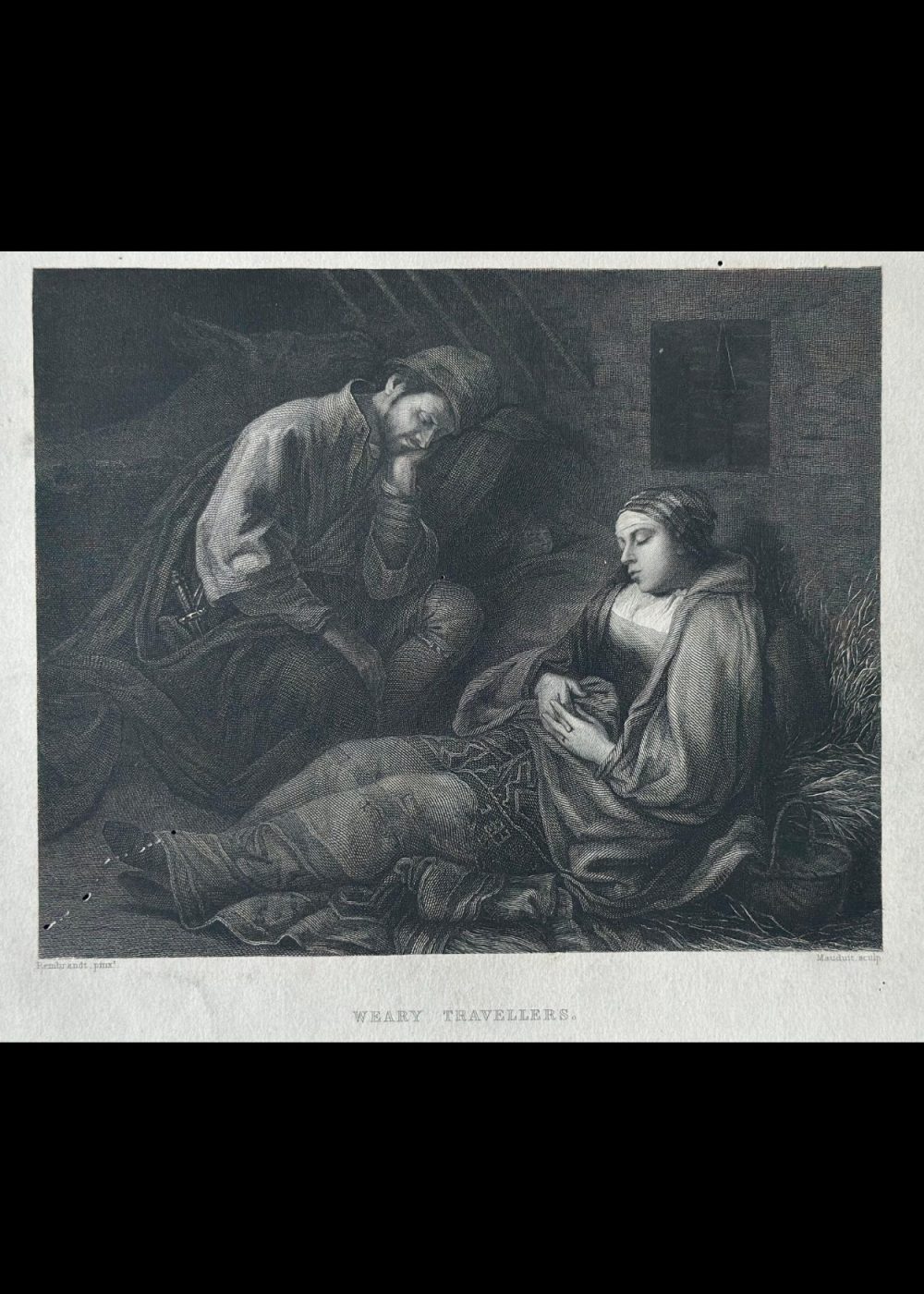 This finely detailed engraving, inspired by the style of Rembrandt and engraved by Mauduit, portrays a poignant scene of two exhausted travelers resting. A man, cloaked and wearing a cap, sits slumped in thought or sleep, while a woman lies beside him, cradling an infant as she rests against a bundle of hay. The setting is humble and dimly lit, with a small window suggesting shelter in a rustic dwelling. The composition emphasizes human fatigue, quiet resilience, and tenderness, capturing a moment of stillness and shared hardship—hallmarks of Rembrandt’s emotive narrative approach.