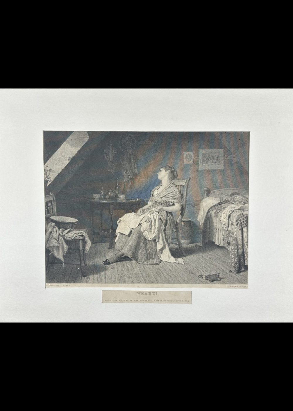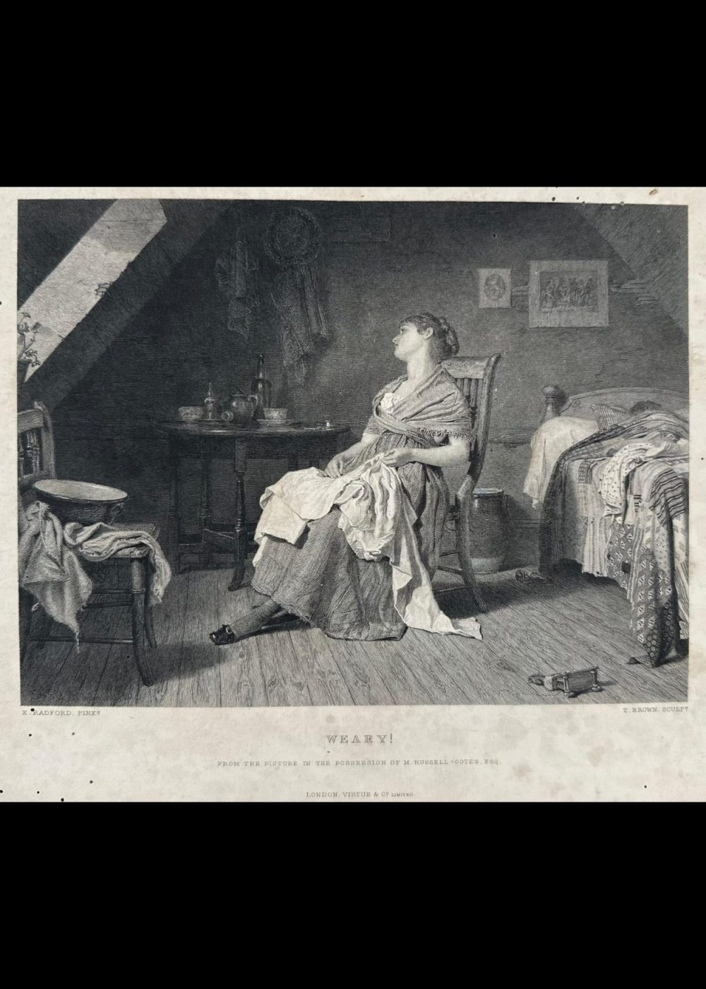 Edward Radford’s Weary, beautifully engraved by Thomas Brown, is a poignant domestic scene that captures the emotional and physical toll of everyday life, particularly for working-class women in the 19th century. A young woman sits slumped in a wooden chair in a small attic room, her posture slack and head tilted back in sheer exhaustion. Her sewing rests on her lap and feet, momentarily abandoned, while household tasks appear half-finished around her. The room is modest but filled with personal touches: clothing draped over the bed and chair, a table with wine bottles and fruit, and a crib tucked near the bed, possibly suggesting the responsibilities of motherhood. A pair of scissors lies on the floor, having dropped from her hand, further emphasizing her drained state. The light entering from the slanted ceiling window adds a soft realism, illuminating her weariness without sentimentality. Radford’s composition, paired with Brown’s precise engraving, is a quiet but powerful reflection on fatigue and domestic labor. It evokes empathy, offering a dignified portrait of a woman paused amid her daily burdens, resonating with timeless relevance. This image is both a social commentary and a tender study of human vulnerability.