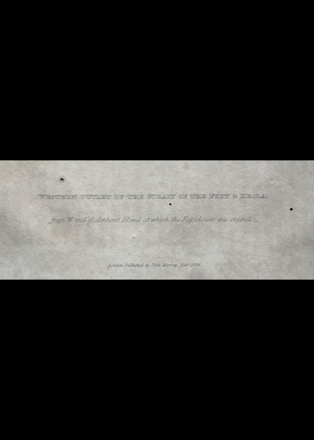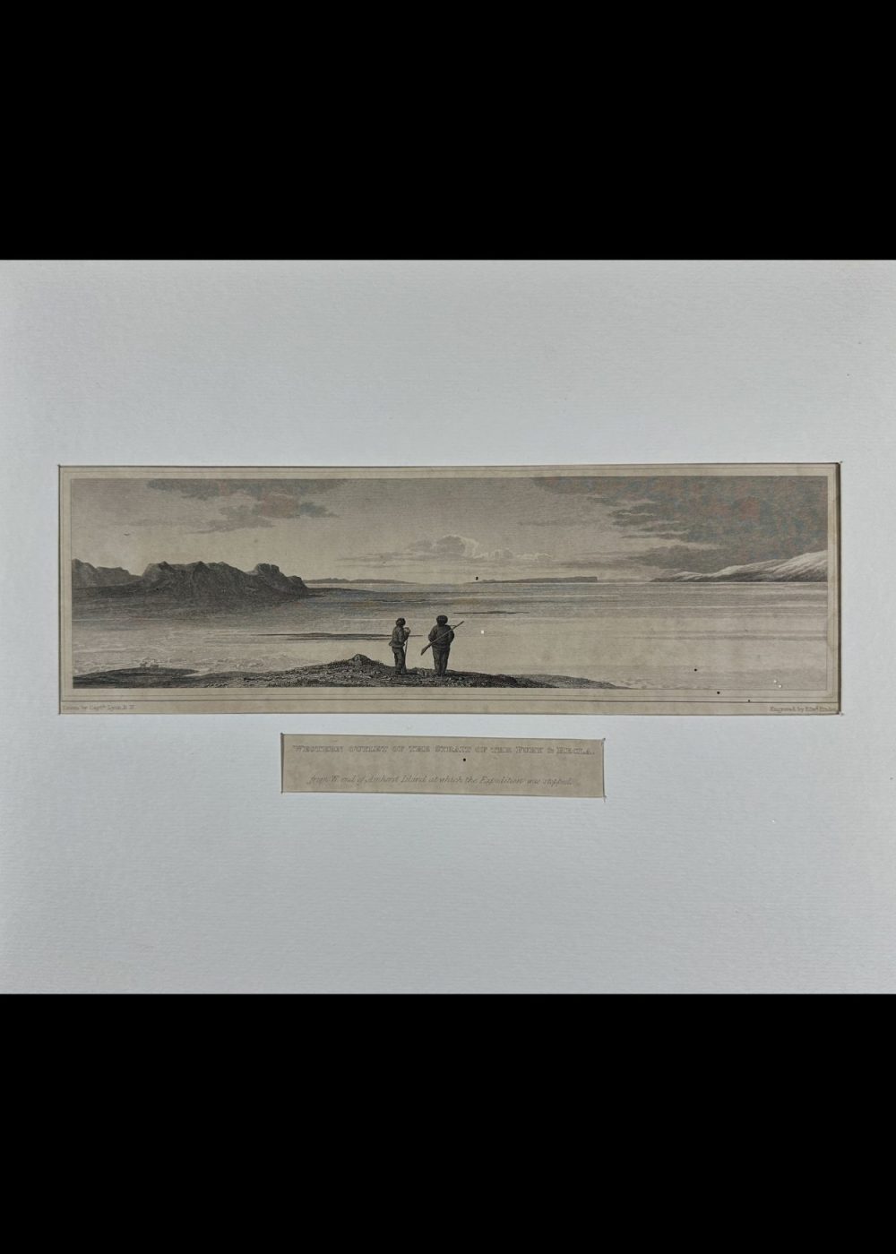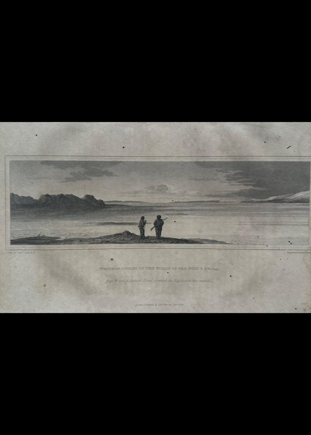 This serene engraving, drawn by Captain Lyon R.N. and engraved by Edward Finden, captures a vast Arctic seascape as seen from the western end of Amherst Island. Two figures stand in the foreground surveying the still waters and distant mountain ranges. The image marks the western entrance to the Strait of the Fury and Hecla, a significant location in early 19th-century polar exploration. The composition conveys both the majesty of the Arctic wilderness and the sense of isolation felt by explorers as their progress was halted by impassable ice.