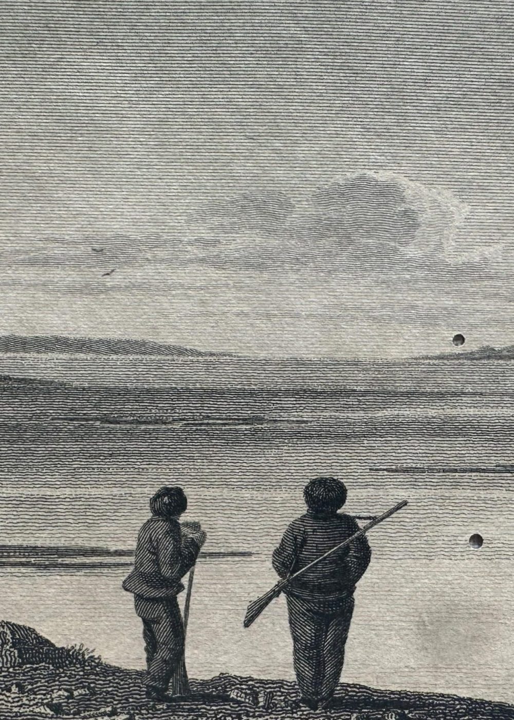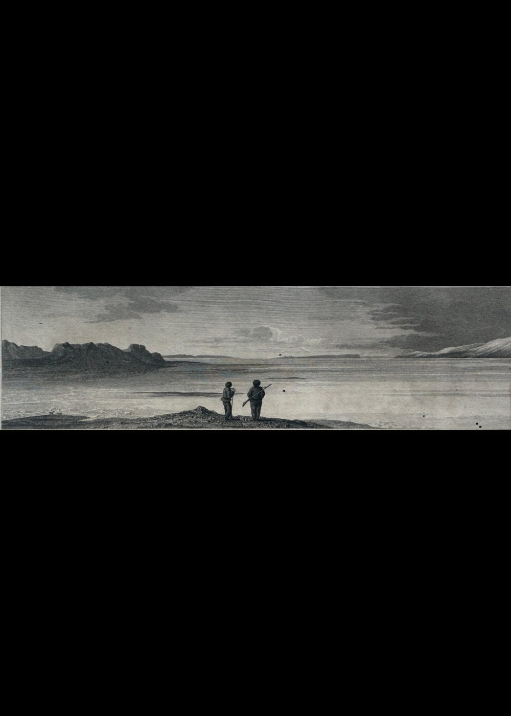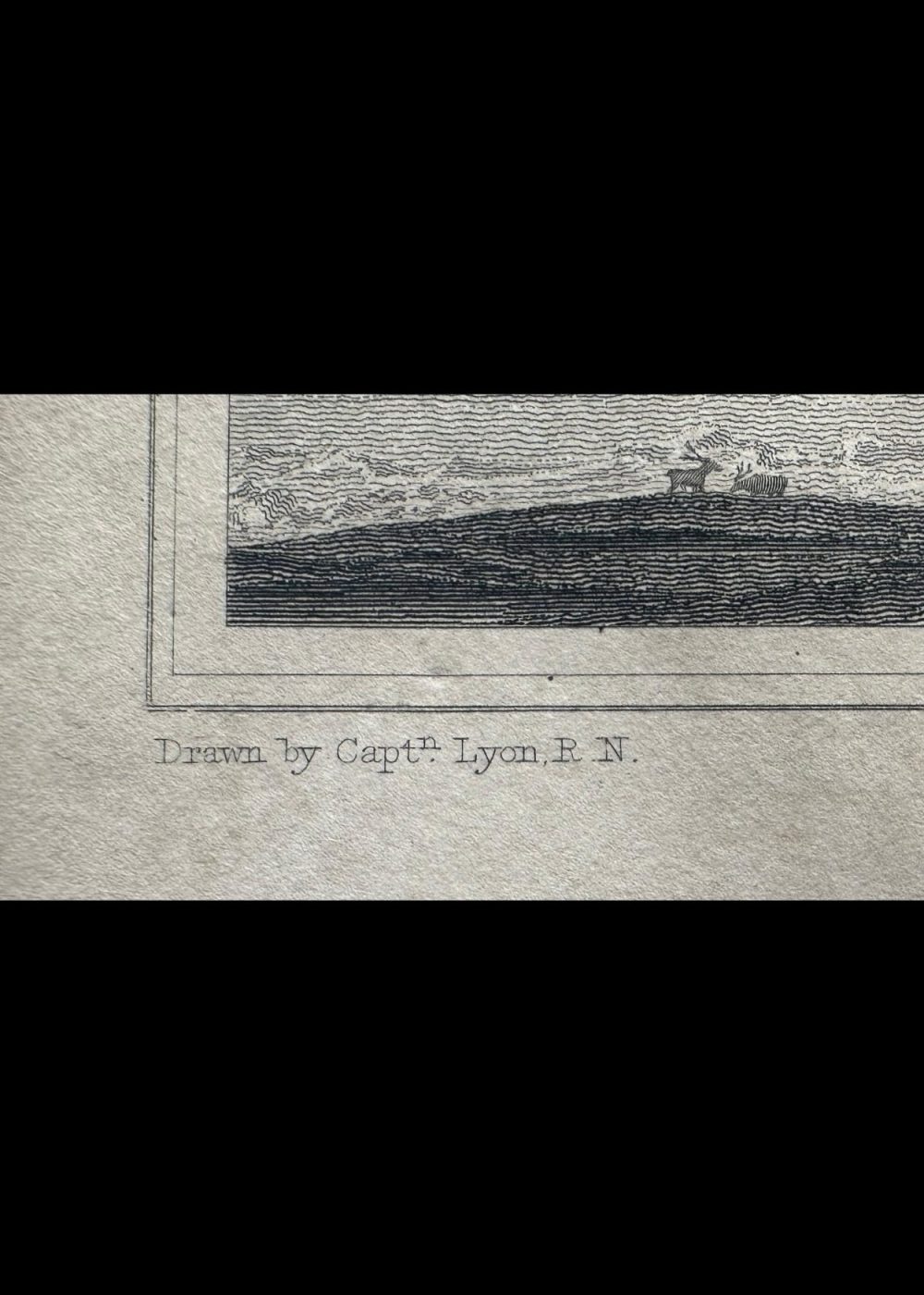This serene engraving, drawn by Captain Lyon R.N. and engraved by Edward Finden, captures a vast Arctic seascape as seen from the western end of Amherst Island. Two figures stand in the foreground surveying the still waters and distant mountain ranges. The image marks the western entrance to the Strait of the Fury and Hecla, a significant location in early 19th-century polar exploration. The composition conveys both the majesty of the Arctic wilderness and the sense of isolation felt by explorers as their progress was halted by impassable ice.