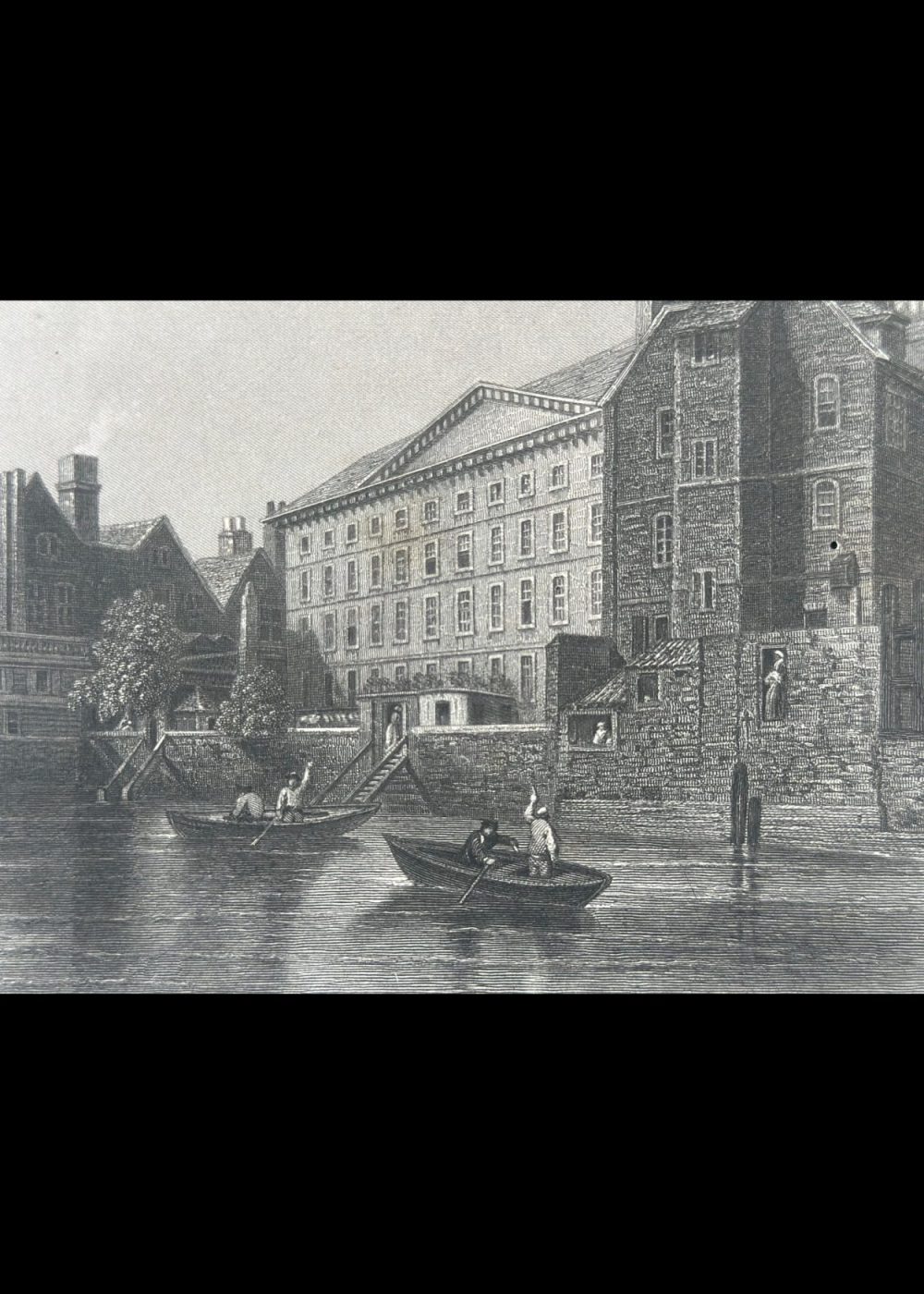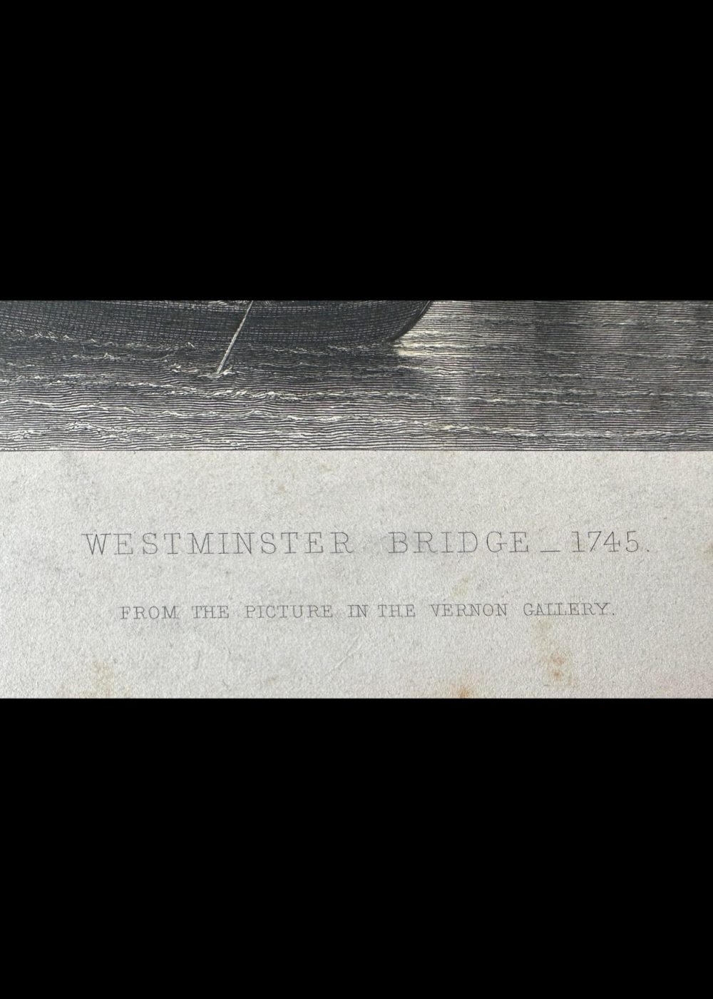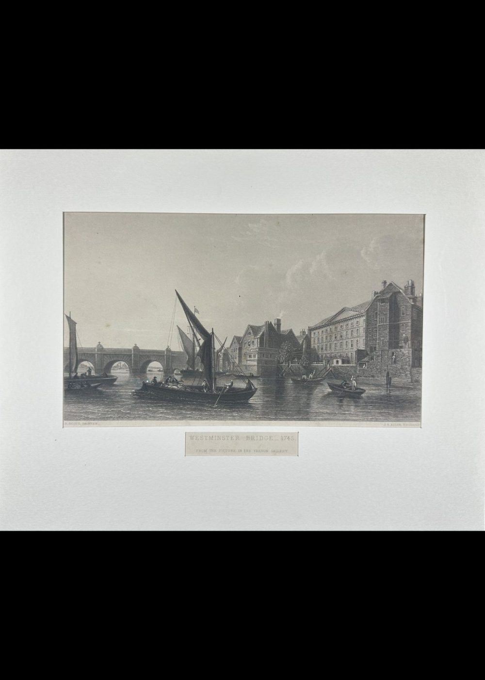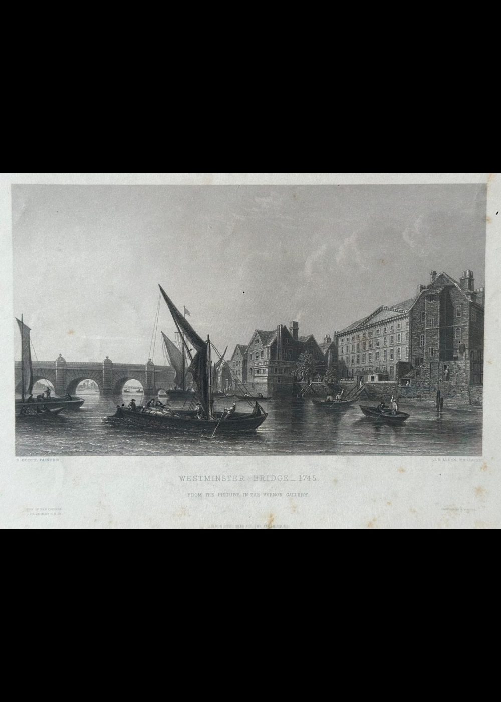 This finely executed engraving by James Baylis Allen, after a painting by Samuel Scott, presents a detailed 18th-century view of Westminster Bridge as it appeared in 1745. The scene captures daily life along the River Thames, with several sailing boats and small vessels actively navigating the waters. The arched structure of the bridge dominates the left side of the composition, while Georgian-style buildings and bustling riverbank activity occupy the right. The engraving showcases architectural precision and lively river commerce, offering a historical glimpse into London’s urban and maritime atmosphere during the mid-18th century.