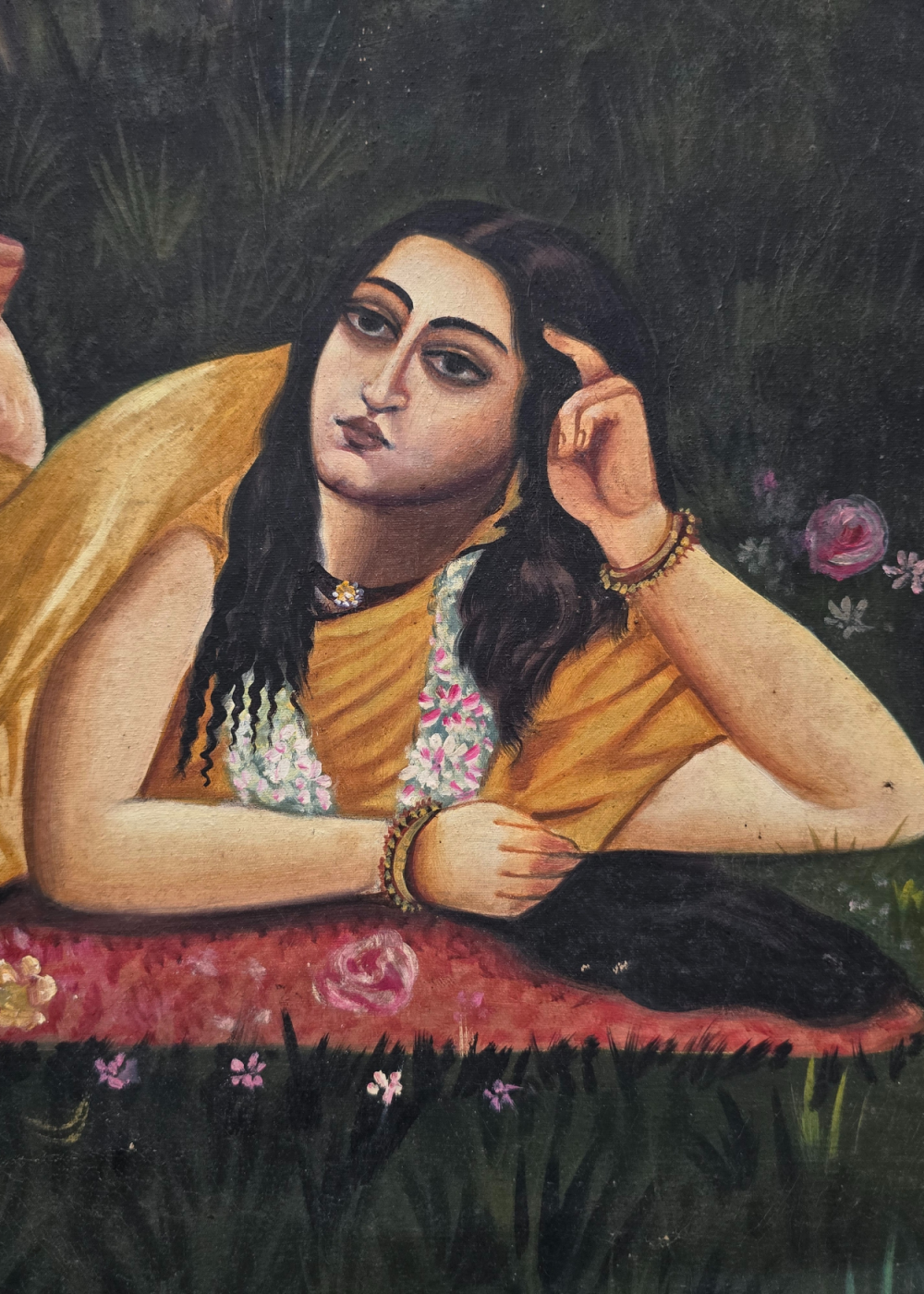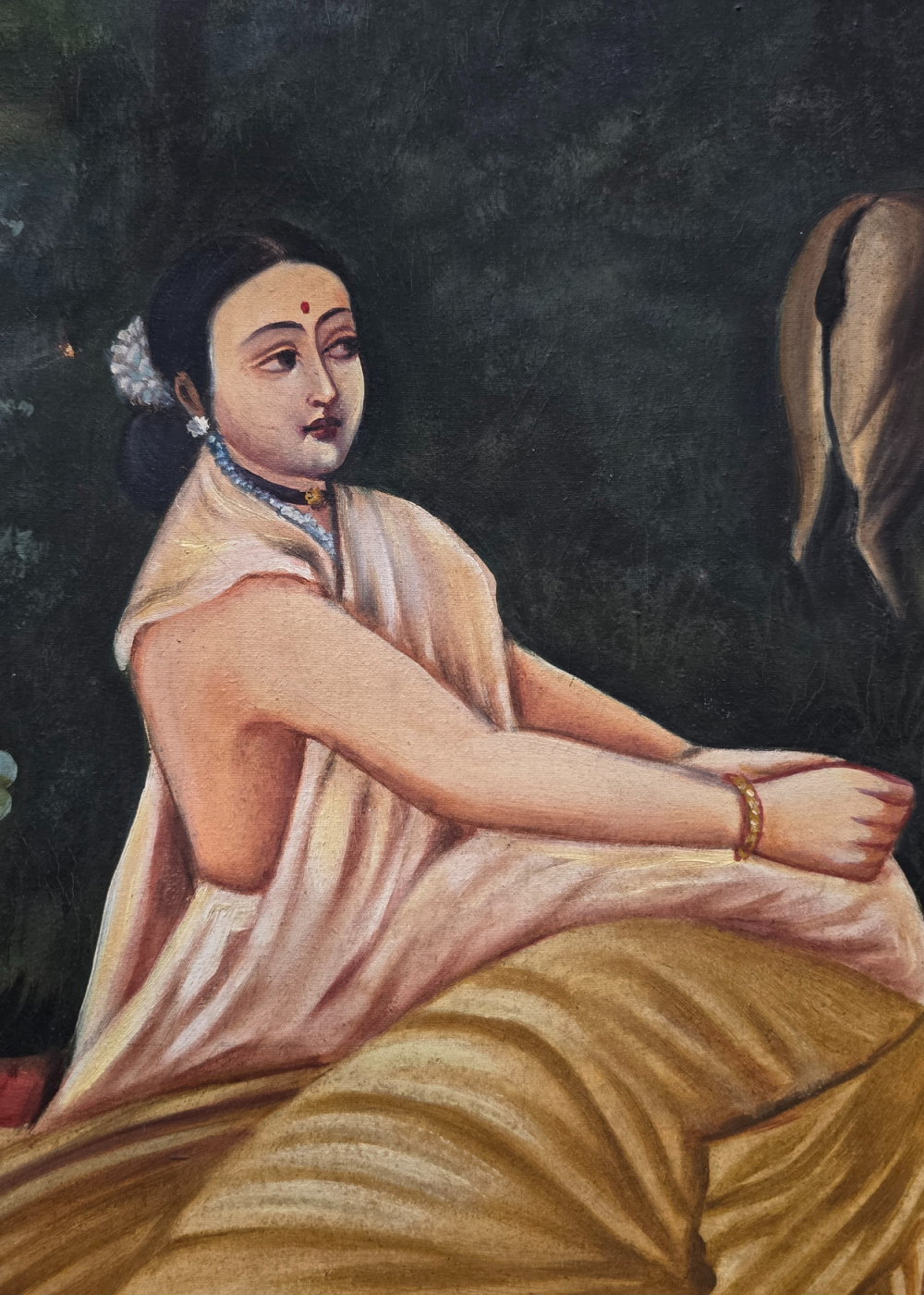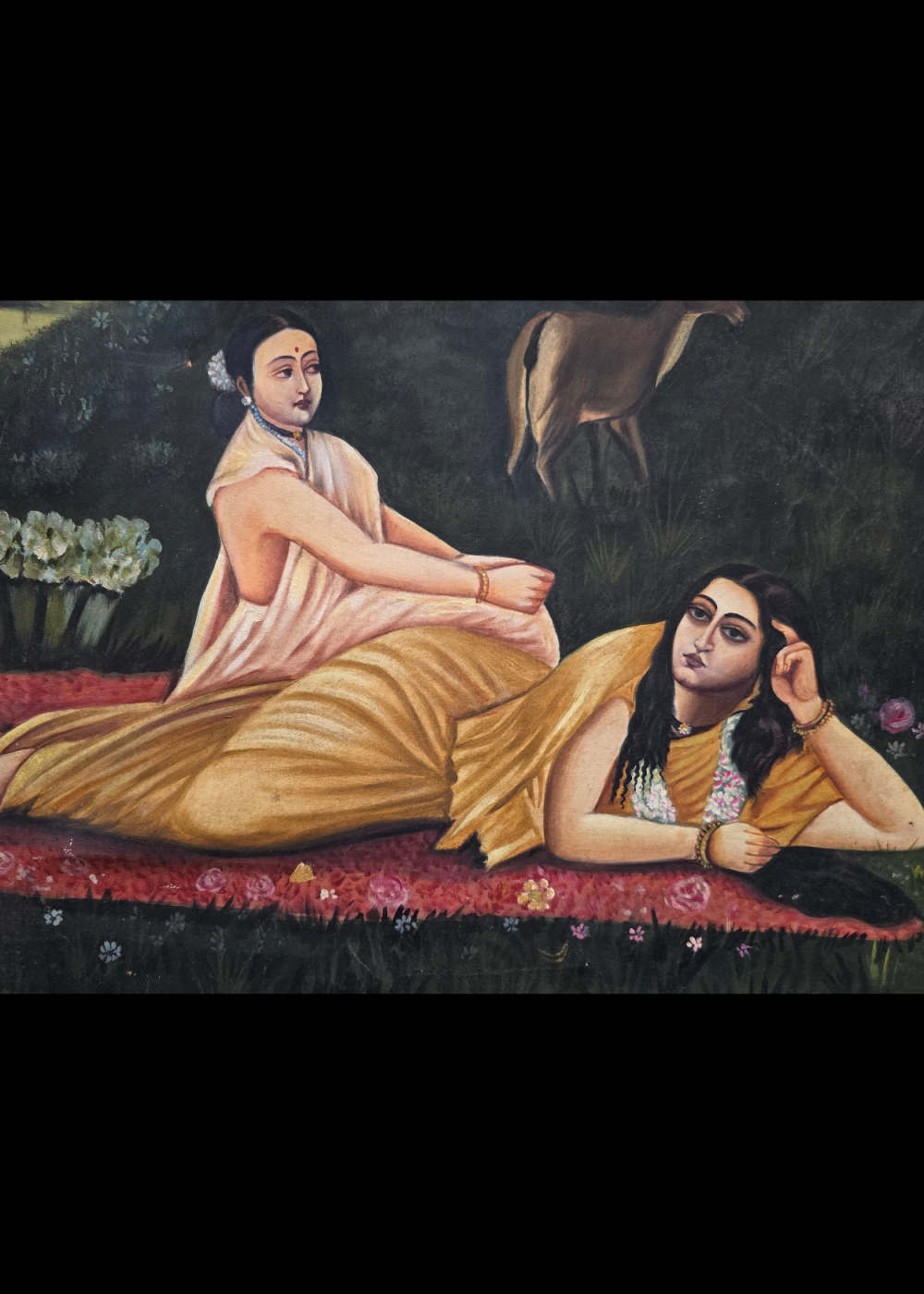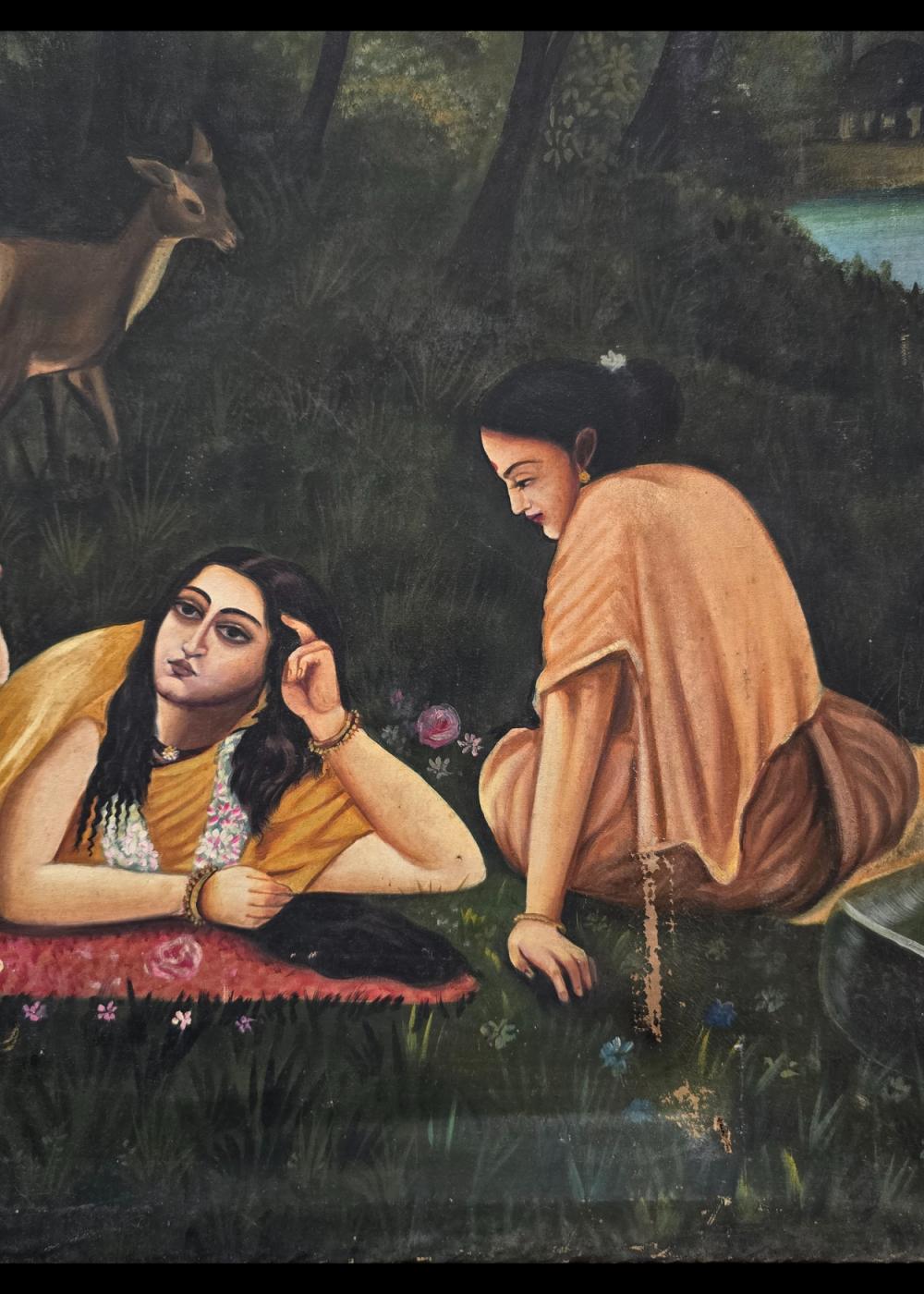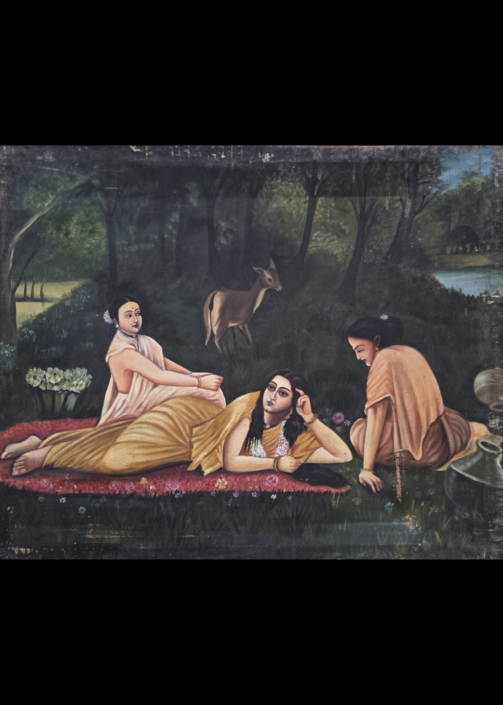 Set in a tranquil forest glade, this serene painting captures a quiet moment of leisure among three women, draped in soft traditional attire. One reclines thoughtfully on a red carpet, while the others sit and engage, their expressions gentle and intimate. Surrounded by blooming flowers, flowing garments, and scattered clay pots, the scene evokes a timeless pastoral charm. A lone deer in the background adds a touch of innocence and harmony with nature, while a distant hut by the water suggests peaceful isolation. The artwork is a celebration of feminine grace, companionship, and nature’s quiet beauty.