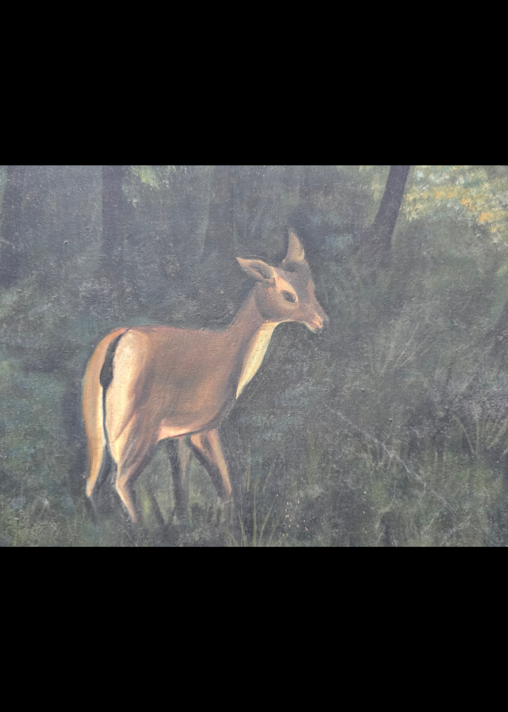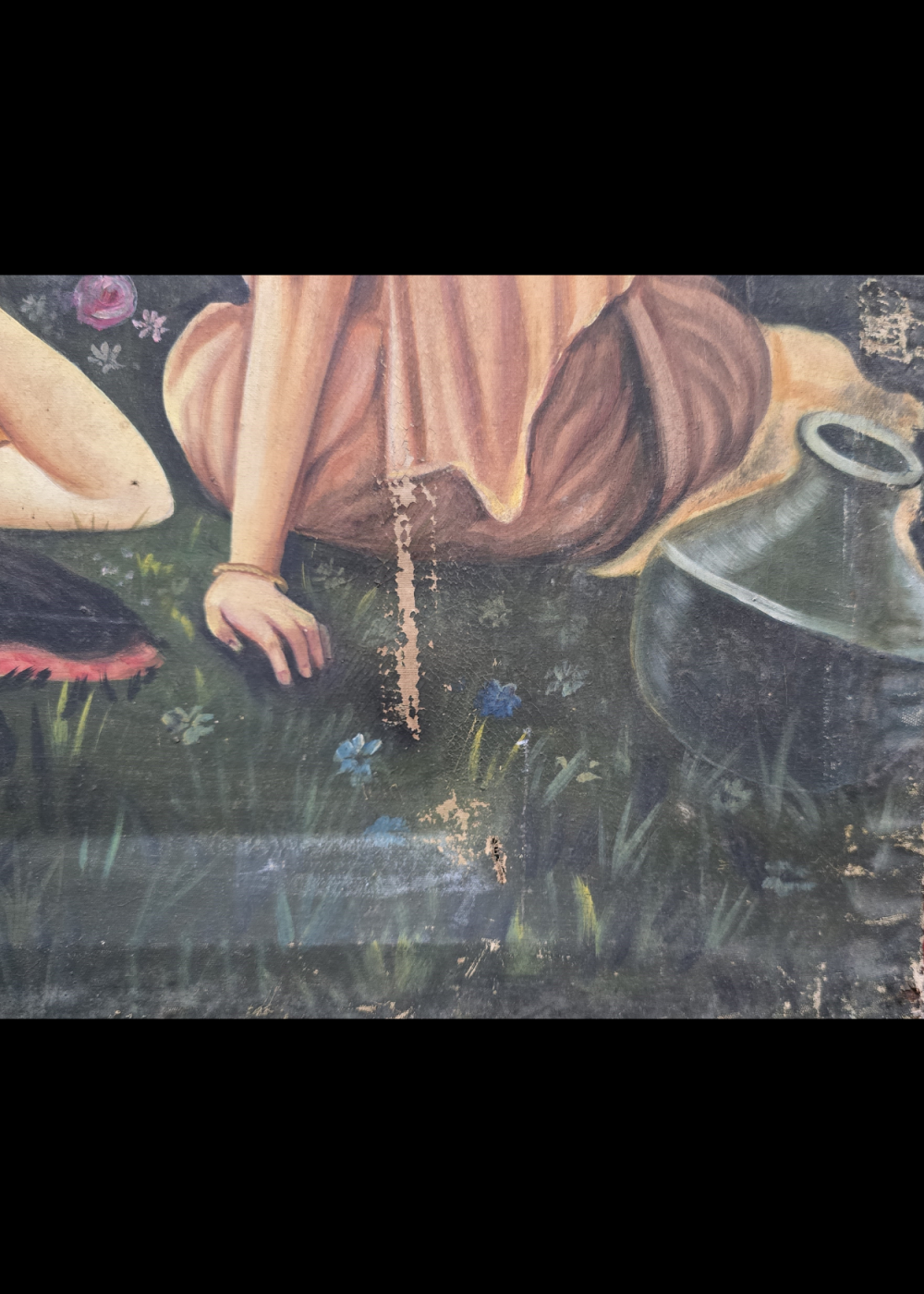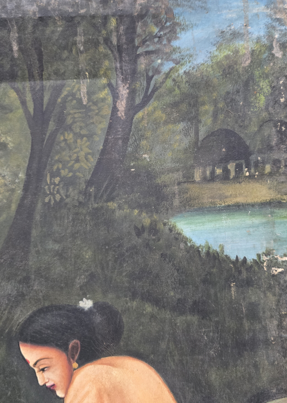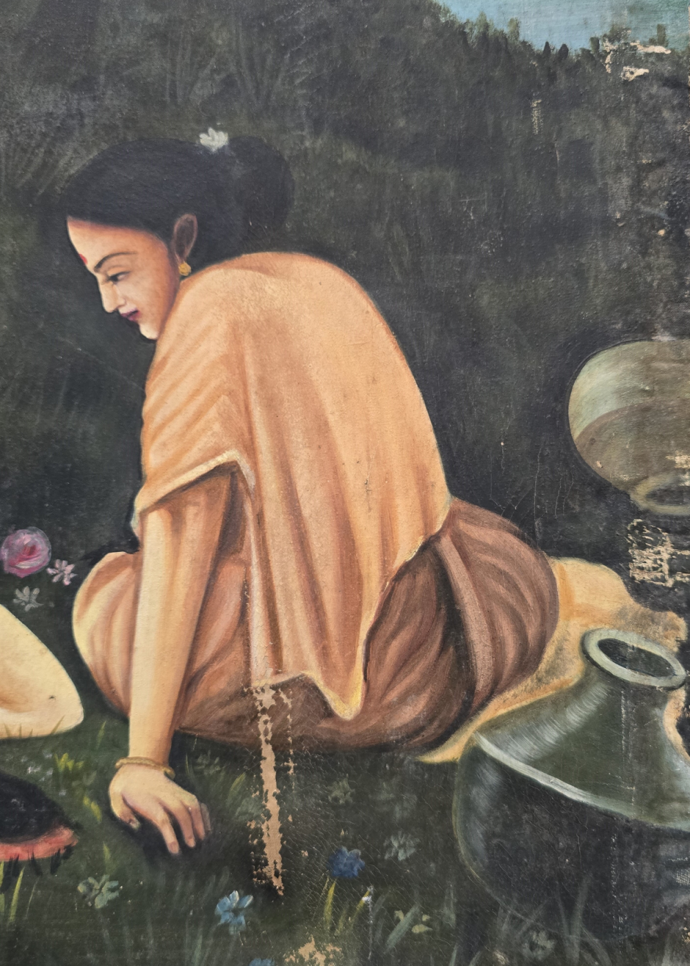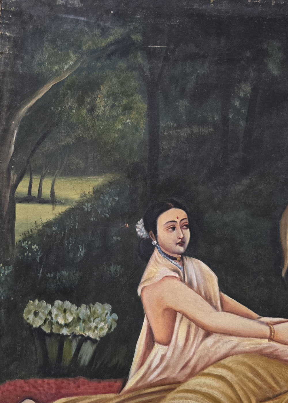 Set in a tranquil forest glade, this serene painting captures a quiet moment of leisure among three women, draped in soft traditional attire. One reclines thoughtfully on a red carpet, while the others sit and engage, their expressions gentle and intimate. Surrounded by blooming flowers, flowing garments, and scattered clay pots, the scene evokes a timeless pastoral charm. A lone deer in the background adds a touch of innocence and harmony with nature, while a distant hut by the water suggests peaceful isolation. The artwork is a celebration of feminine grace, companionship, and nature’s quiet beauty.