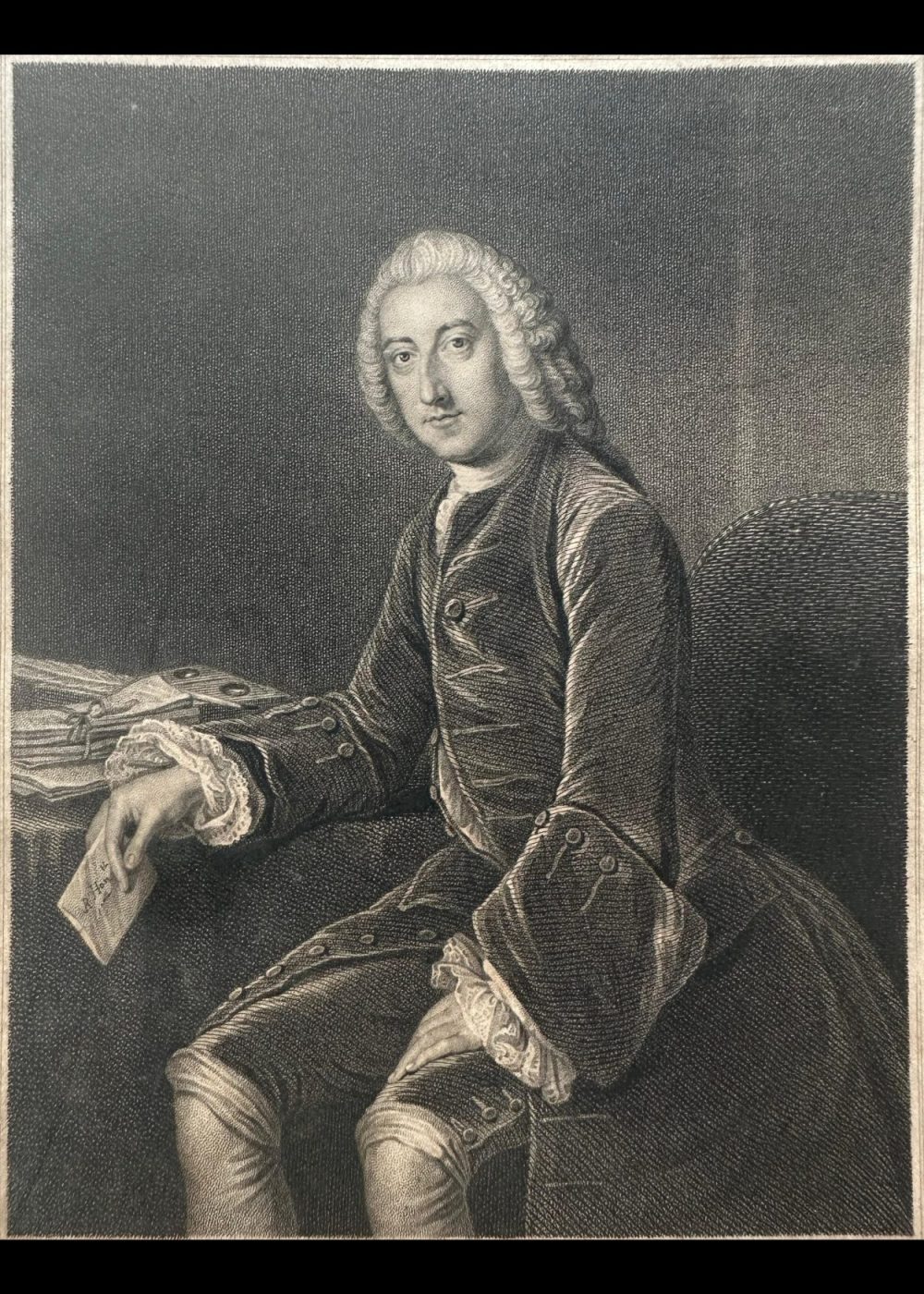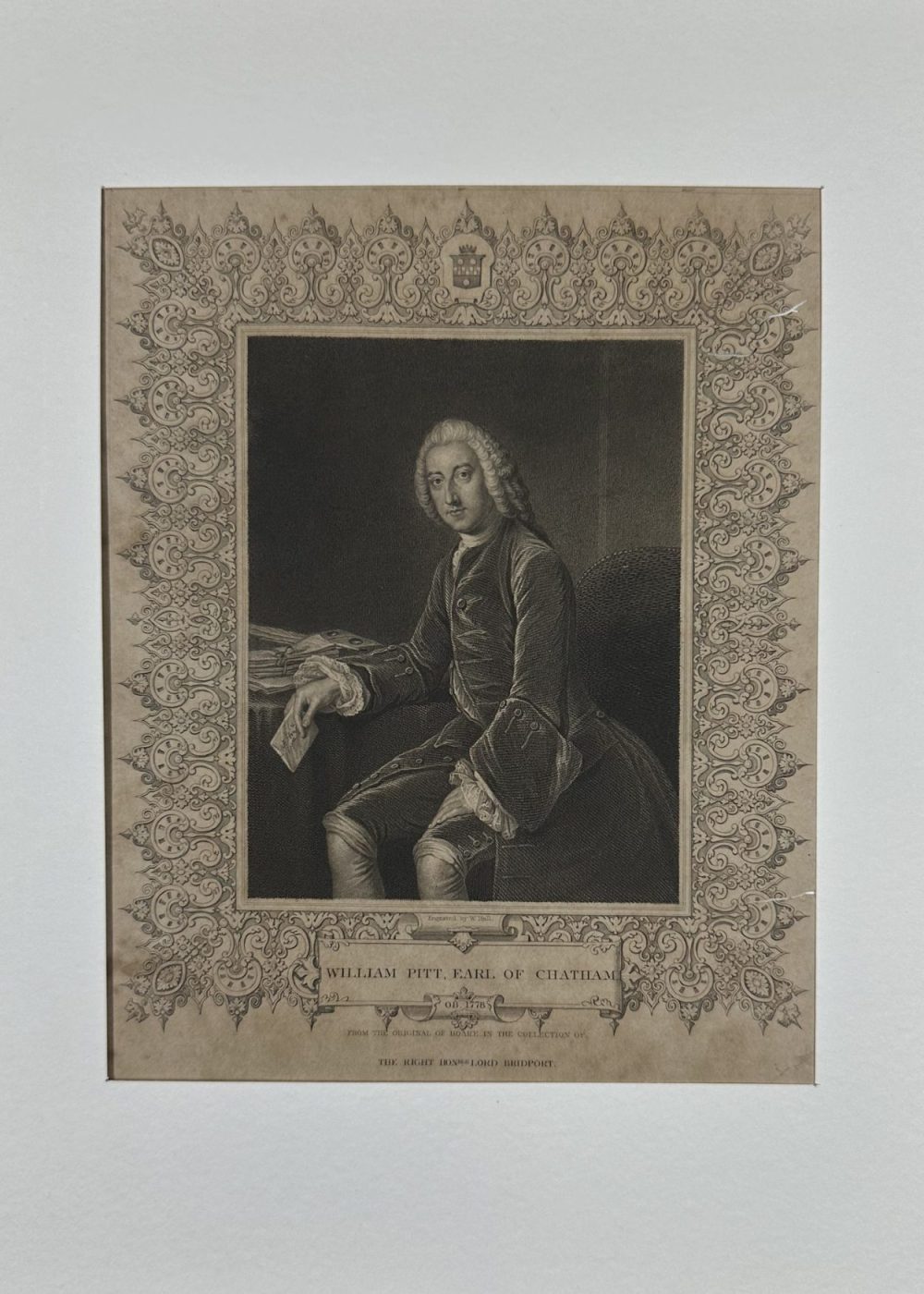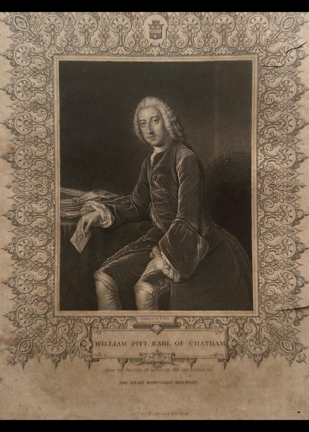 This stately 19th-century engraving depicts William Pitt, 1st Earl of Chatham, a leading British statesman and orator of the 18th century, known for his role in strengthening Britain’s empire during the Seven Years’ War. Shown seated at a desk with papers and a letter in hand, Pitt is captured in a moment of thoughtful reflection, embodying his influence in shaping imperial policy. The engraving is based on the original by Romney, from the collection of The Right Honourable Lord Bridport, and is surrounded by a finely detailed ornamental border. Published by J. & F. Tallis, London & New York.