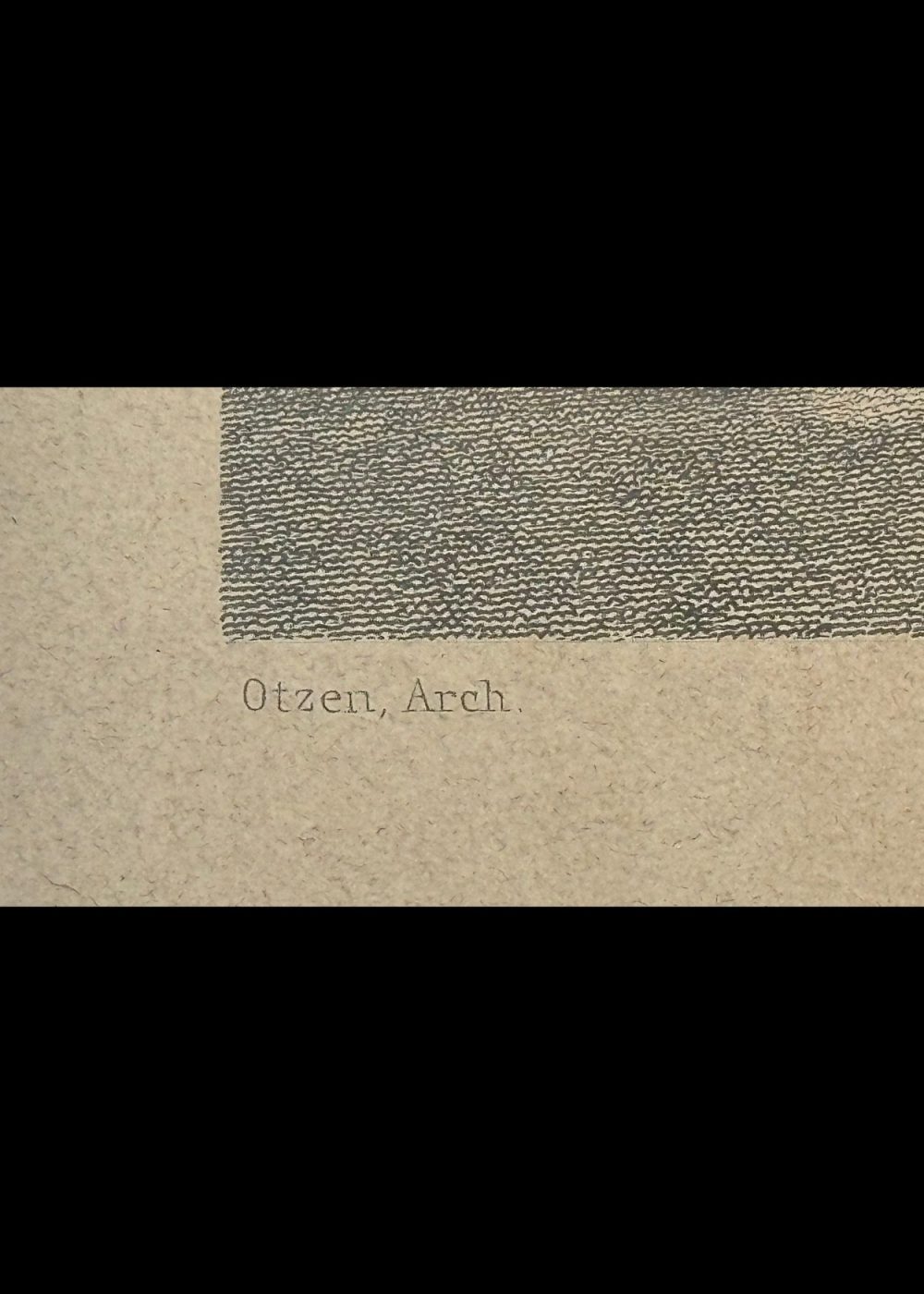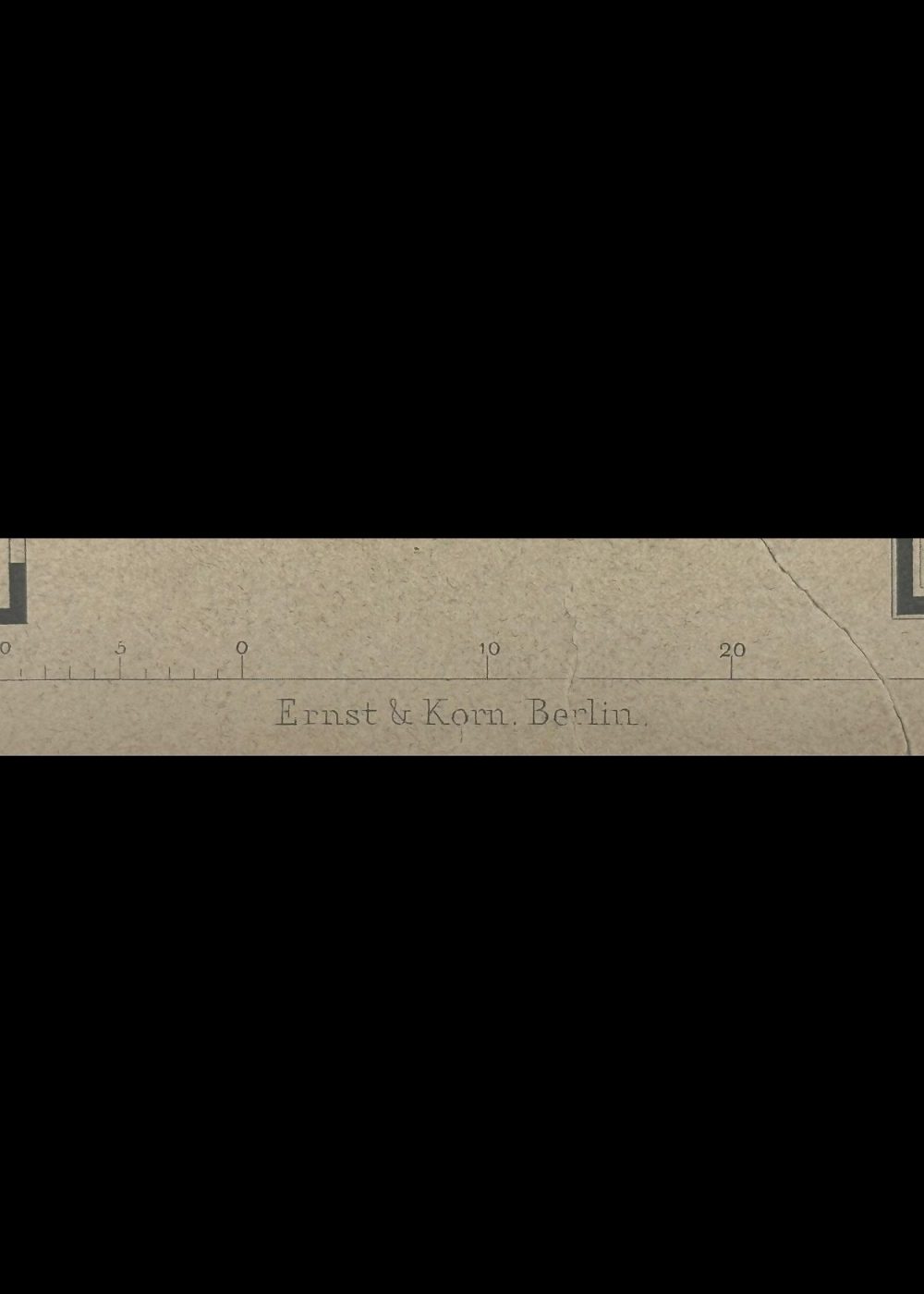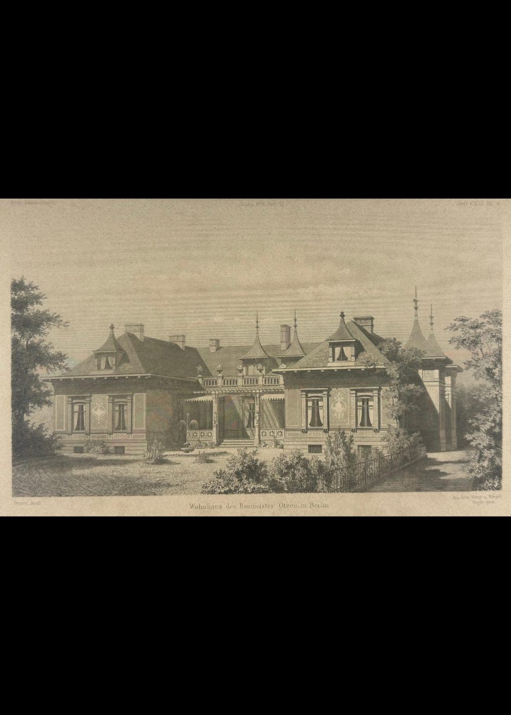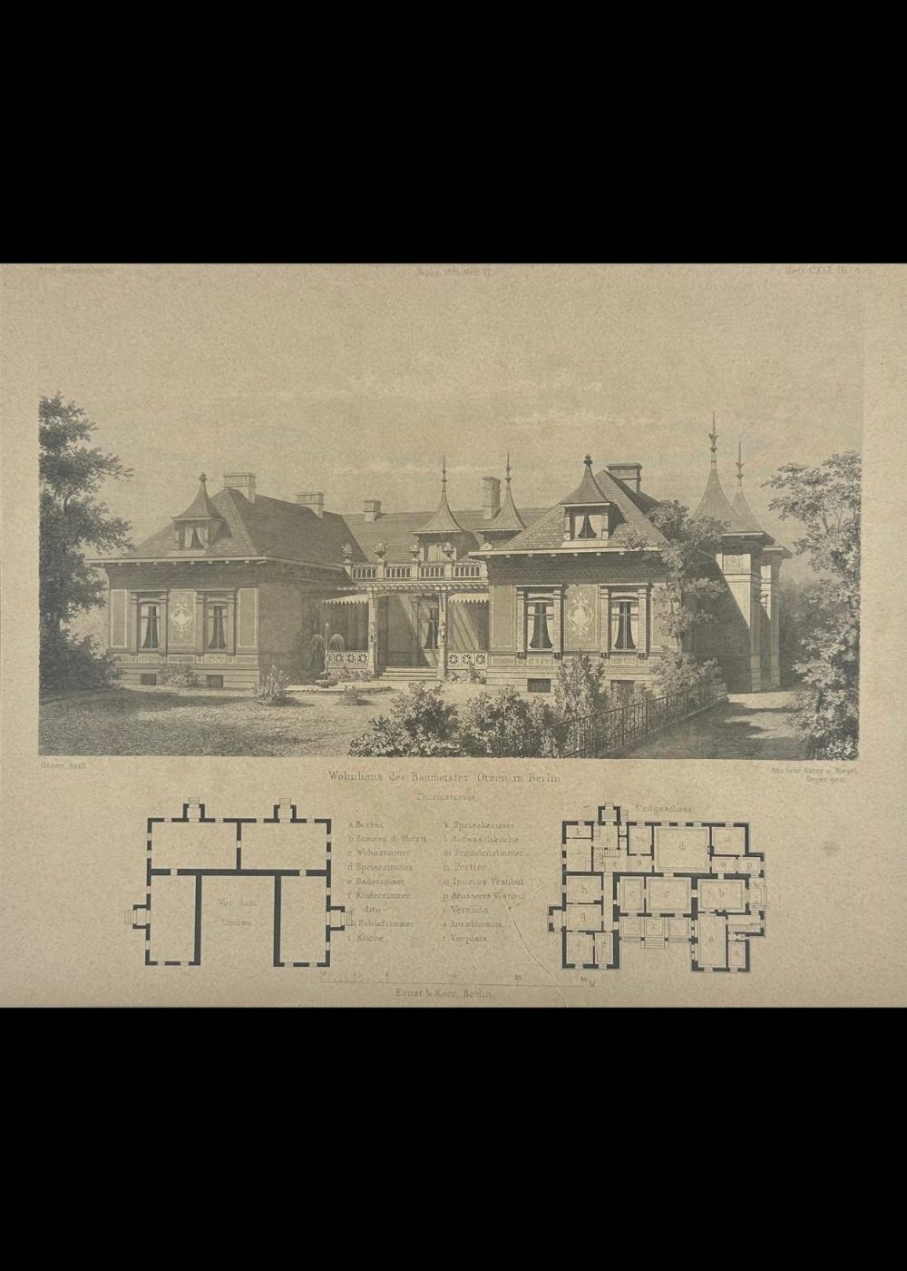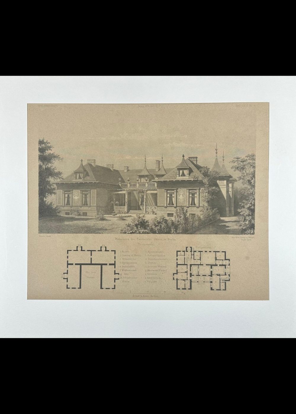 This 19th-century lithograph depicts the residence of master builder Johannes Otzen in Berlin. Showcasing eclectic historicist architecture, the house features ornate detailing, pointed towers, and decorative façades that highlight the rich stylistic blend typical of the period. Created in 1876, the illustration captures the elegance and craftsmanship of German residential design in the late 19th century.