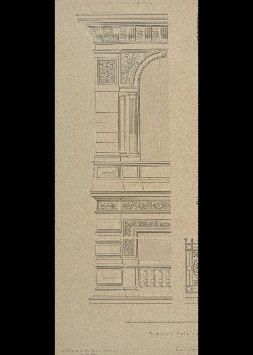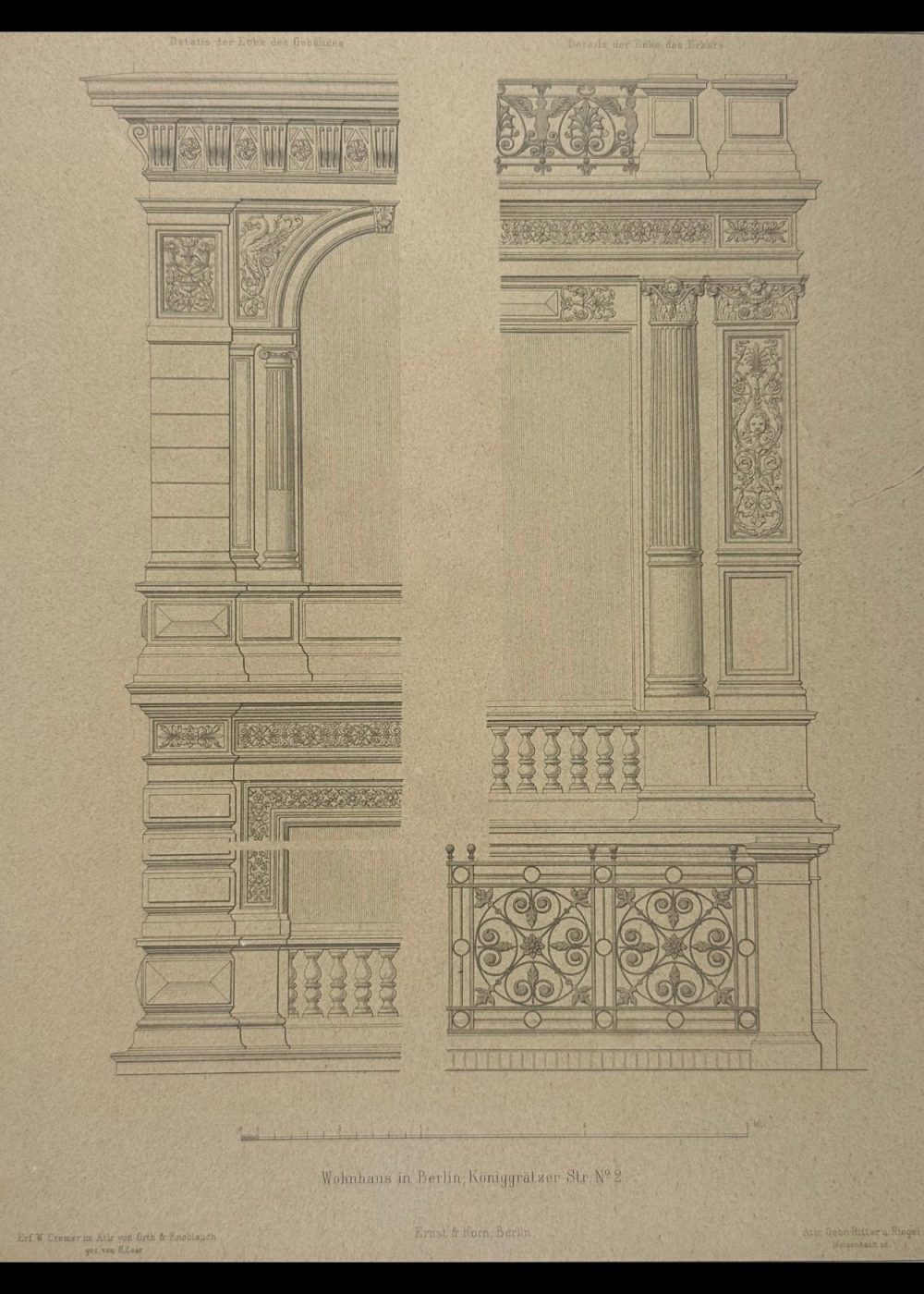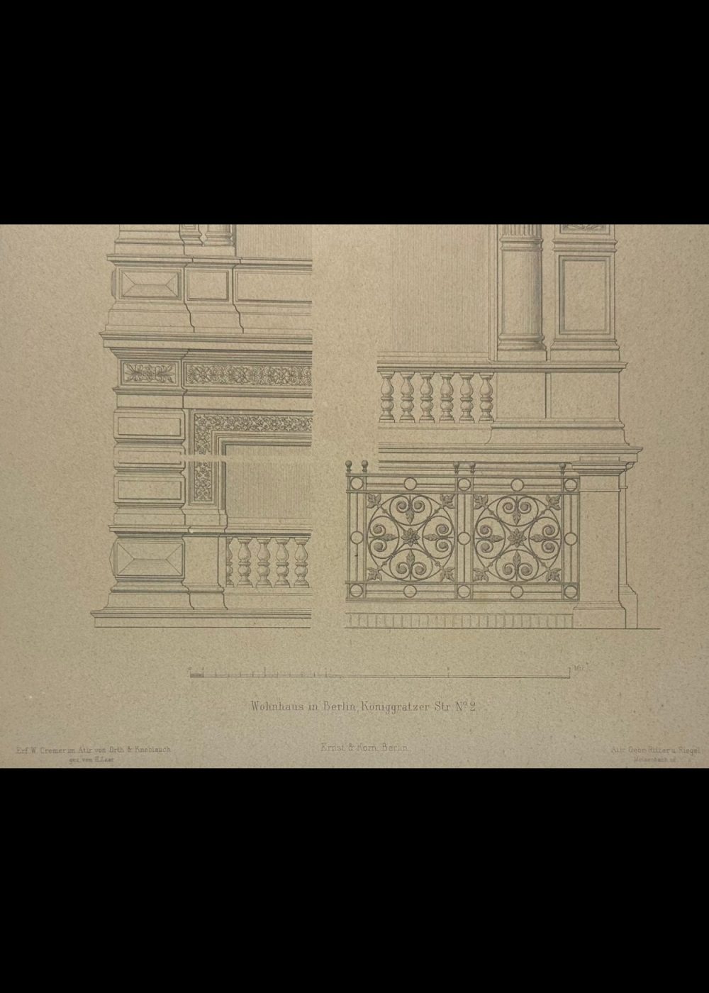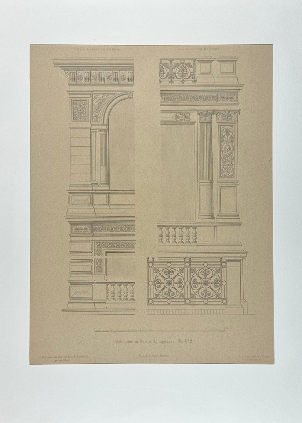 This detailed 19th-century lithograph presents architectural elements from the townhouse at Königgrätzer Straße No. 2 in Berlin. It showcases ornate façade components including column capitals, cornices, architraves, balcony railings, and decorative friezes, all rendered in the Neorenaissance style. The precise linework emphasizes the craftsmanship and ornamental richness of the building’s stone and wrought-iron features. Published by Ernst & Korn, Berlin, the illustration serves as an architectural study highlighting classical revival aesthetics in urban residential architecture of the time..