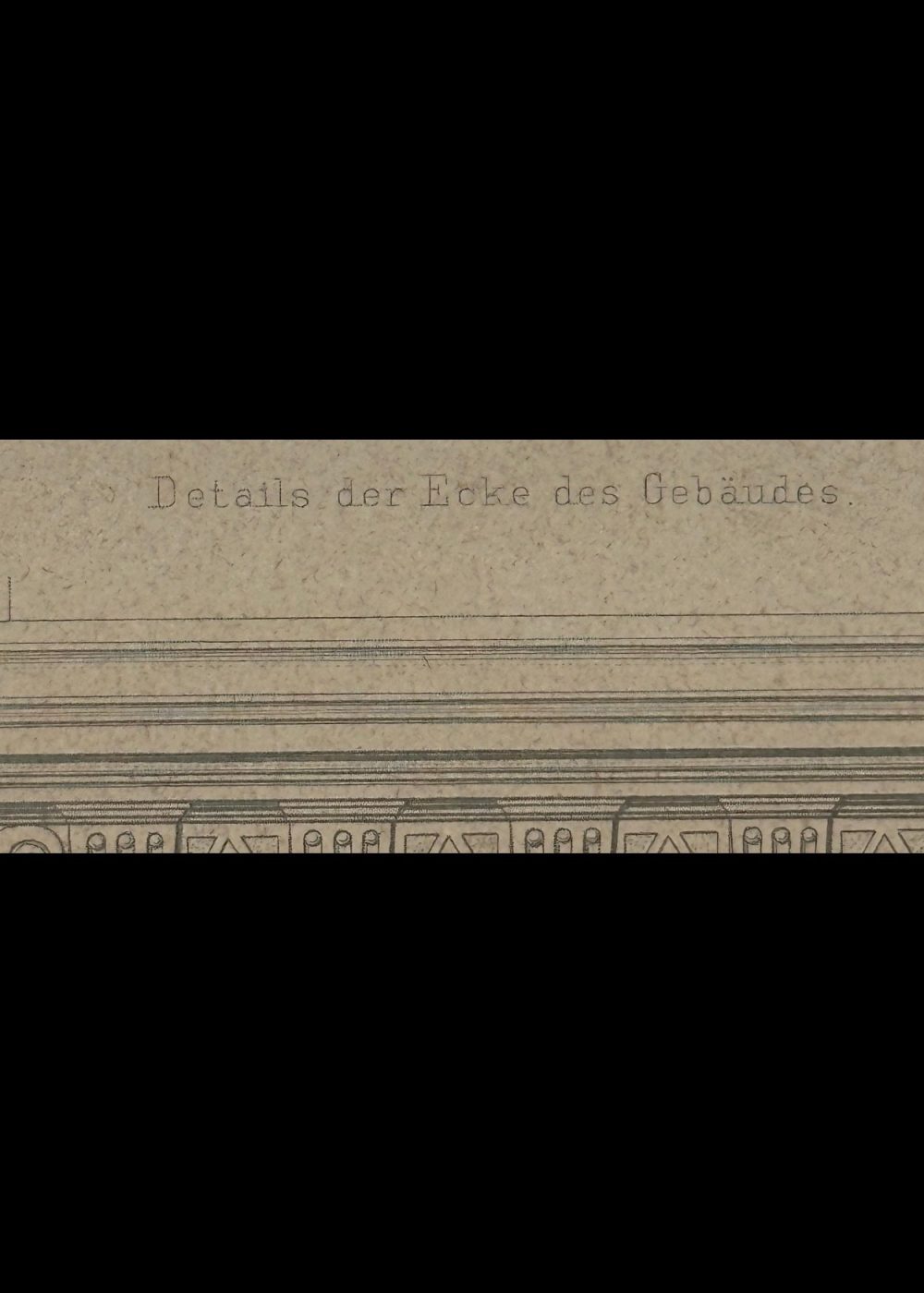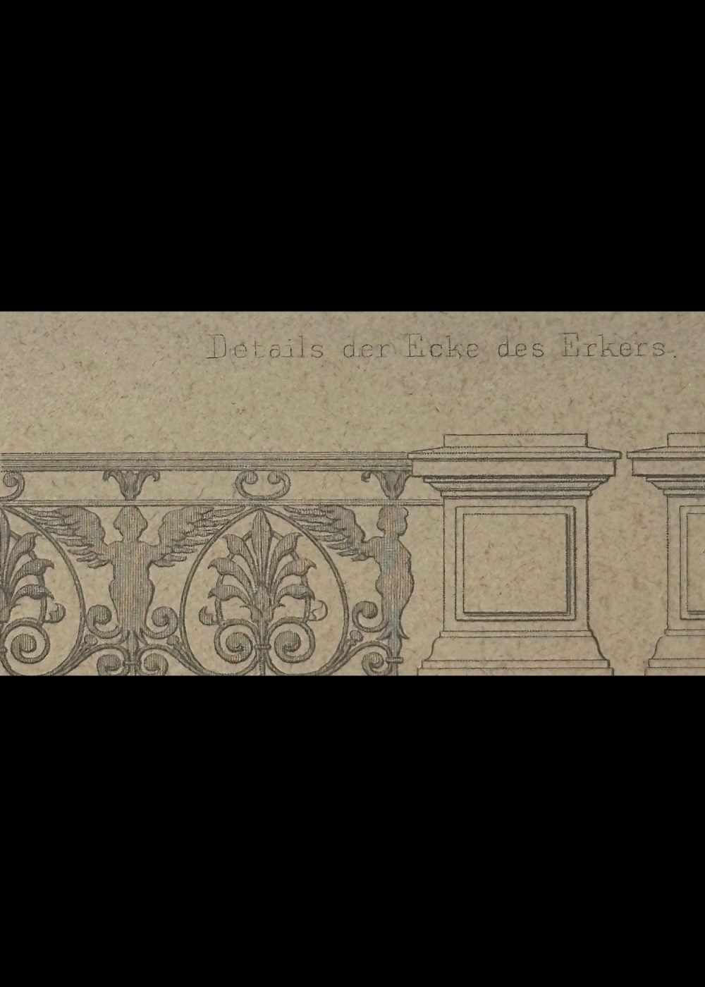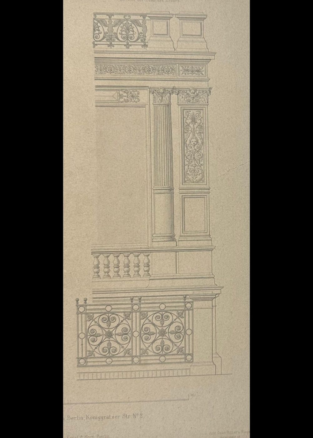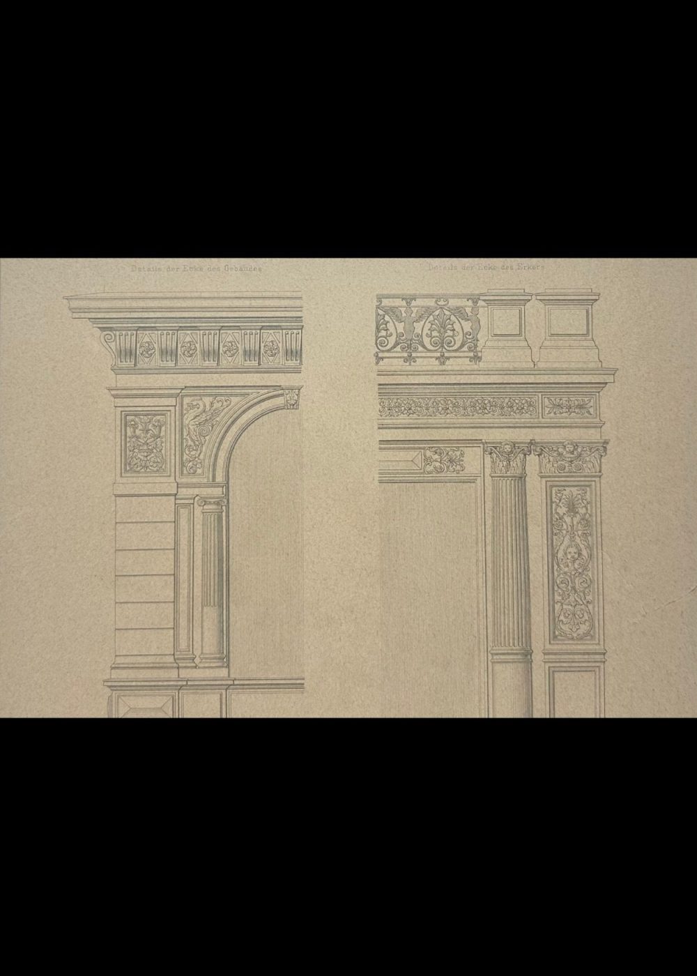 This detailed 19th-century lithograph presents architectural elements from the townhouse at Königgrätzer Straße No. 2 in Berlin. It showcases ornate façade components including column capitals, cornices, architraves, balcony railings, and decorative friezes, all rendered in the Neorenaissance style. The precise linework emphasizes the craftsmanship and ornamental richness of the building’s stone and wrought-iron features. Published by Ernst & Korn, Berlin, the illustration serves as an architectural study highlighting classical revival aesthetics in urban residential architecture of the time..