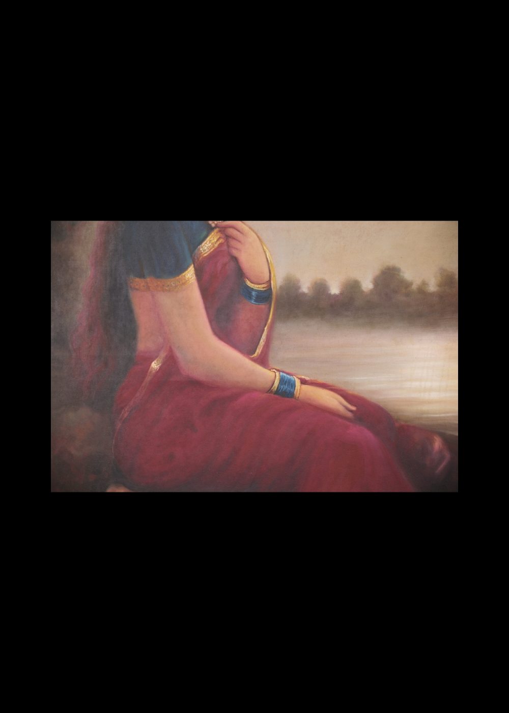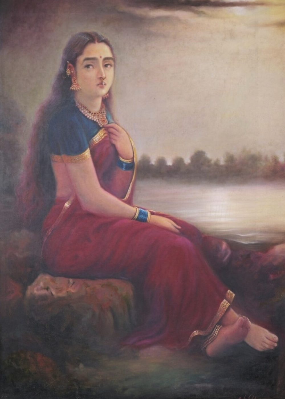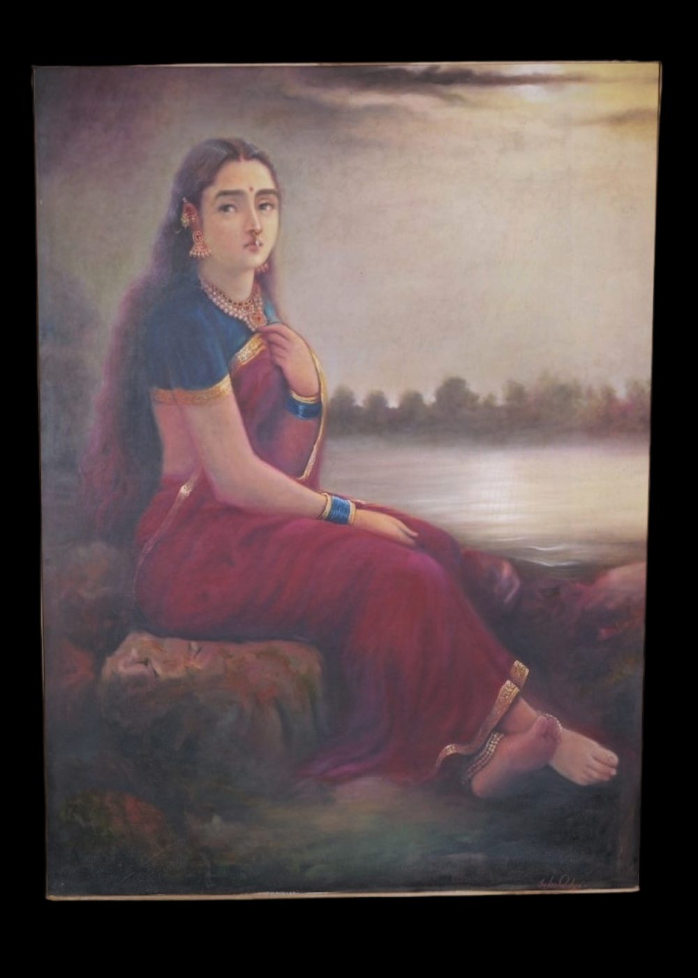 This poignant painting depicts a young Indian woman seated on a rock by a calm riverside, enveloped in the soft glow of twilight. Draped in a rich maroon saree with a contrasting blue blouse, she exudes quiet elegance and thoughtfulness. Her jewelry and long flowing hair add to the classical charm, while the reflective water and distant treeline suggest a mood of longing or introspection. Evocative of Raja Ravi Varma’s romantic style, the painting captures a timeless moment of solitude and emotional depth against a serene natural backdrop.