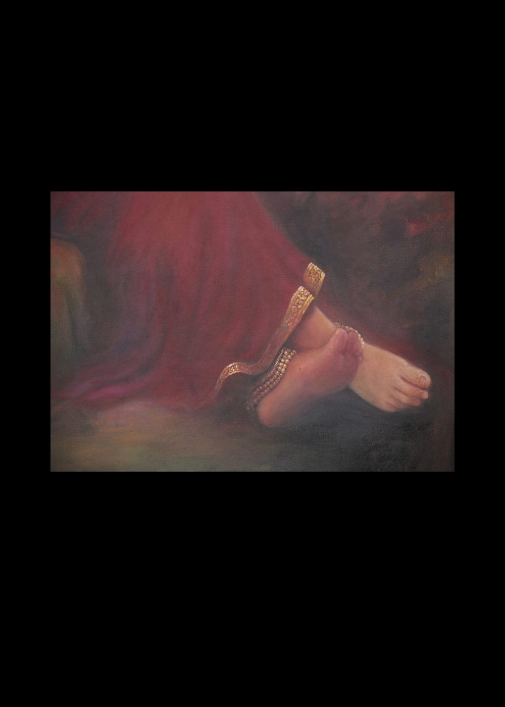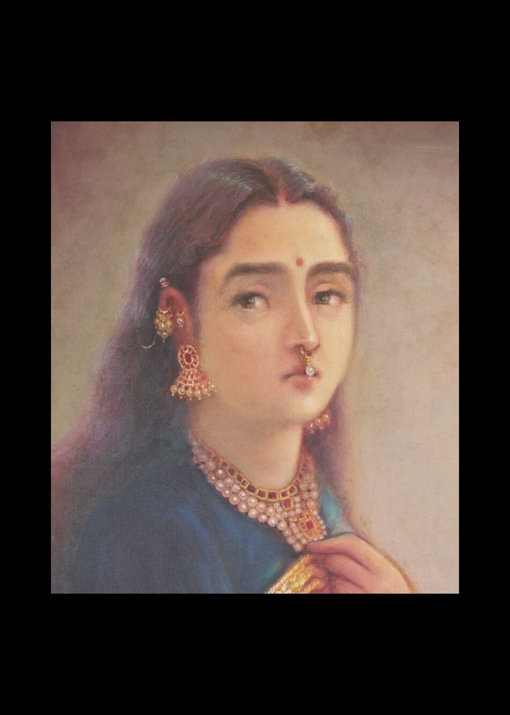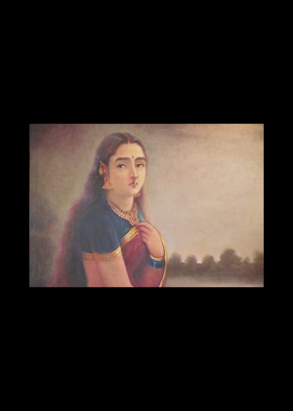 This poignant painting depicts a young Indian woman seated on a rock by a calm riverside, enveloped in the soft glow of twilight. Draped in a rich maroon saree with a contrasting blue blouse, she exudes quiet elegance and thoughtfulness. Her jewelry and long flowing hair add to the classical charm, while the reflective water and distant treeline suggest a mood of longing or introspection. Evocative of Raja Ravi Varma’s romantic style, the painting captures a timeless moment of solitude and emotional depth against a serene natural backdrop.