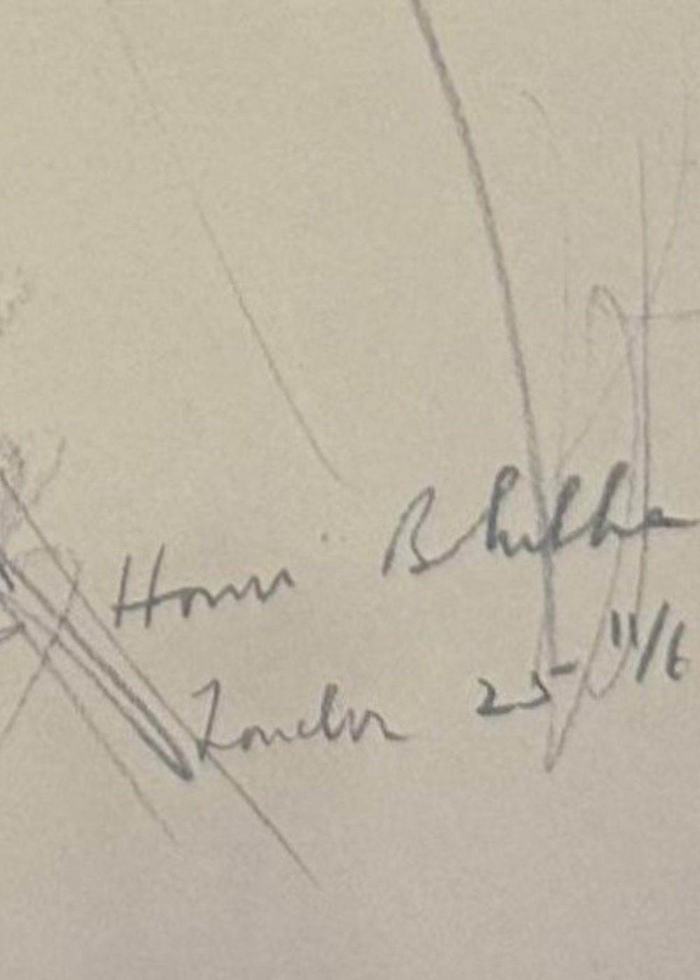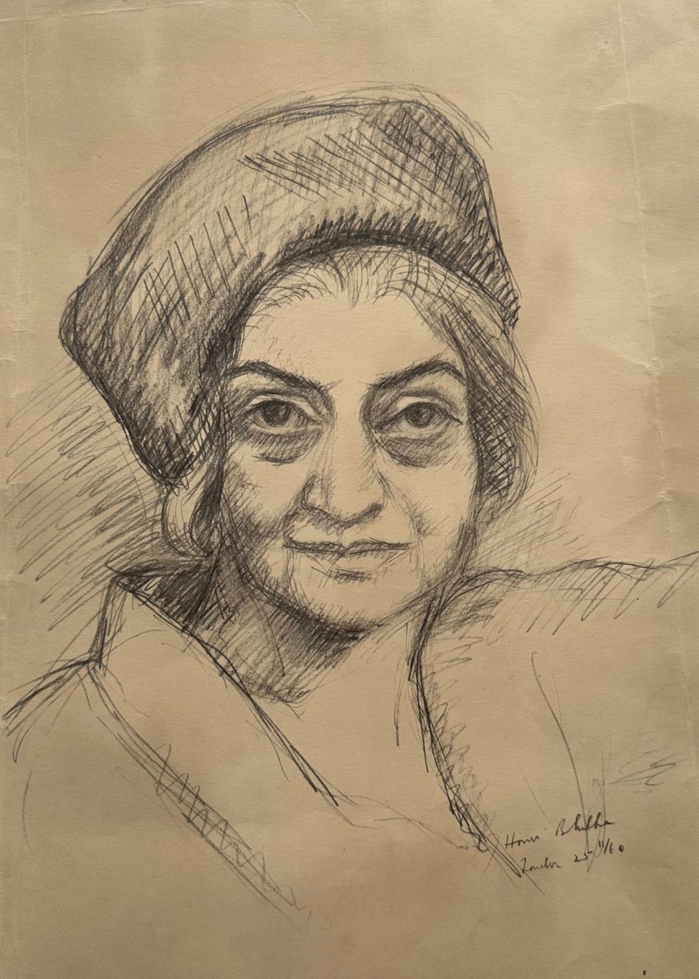 In this early lithograph, Homi Bhabha captures the character and quiet dignity of a woman wearing a soft cap, her direct gaze engaging the viewer with subtle confidence. The strong tonal contrasts, achieved through crosshatching and dark contouring, bring striking clarity to her facial features, especially the eyes, which convey resilience and thoughtfulness. The softness of the cap and coat adds texture and volume, framing the face with gentle rhythm. Created during Bhabha’s time in London, the portrait is dated 25 December 1940, possibly suggesting a personal or seasonal significance. The work demonstrates Bhabha’s early fluency in portraiture—fusing observational realism with emotional depth.