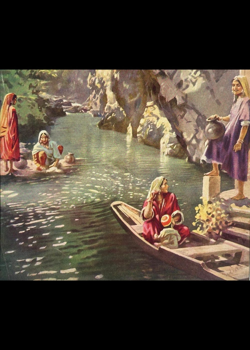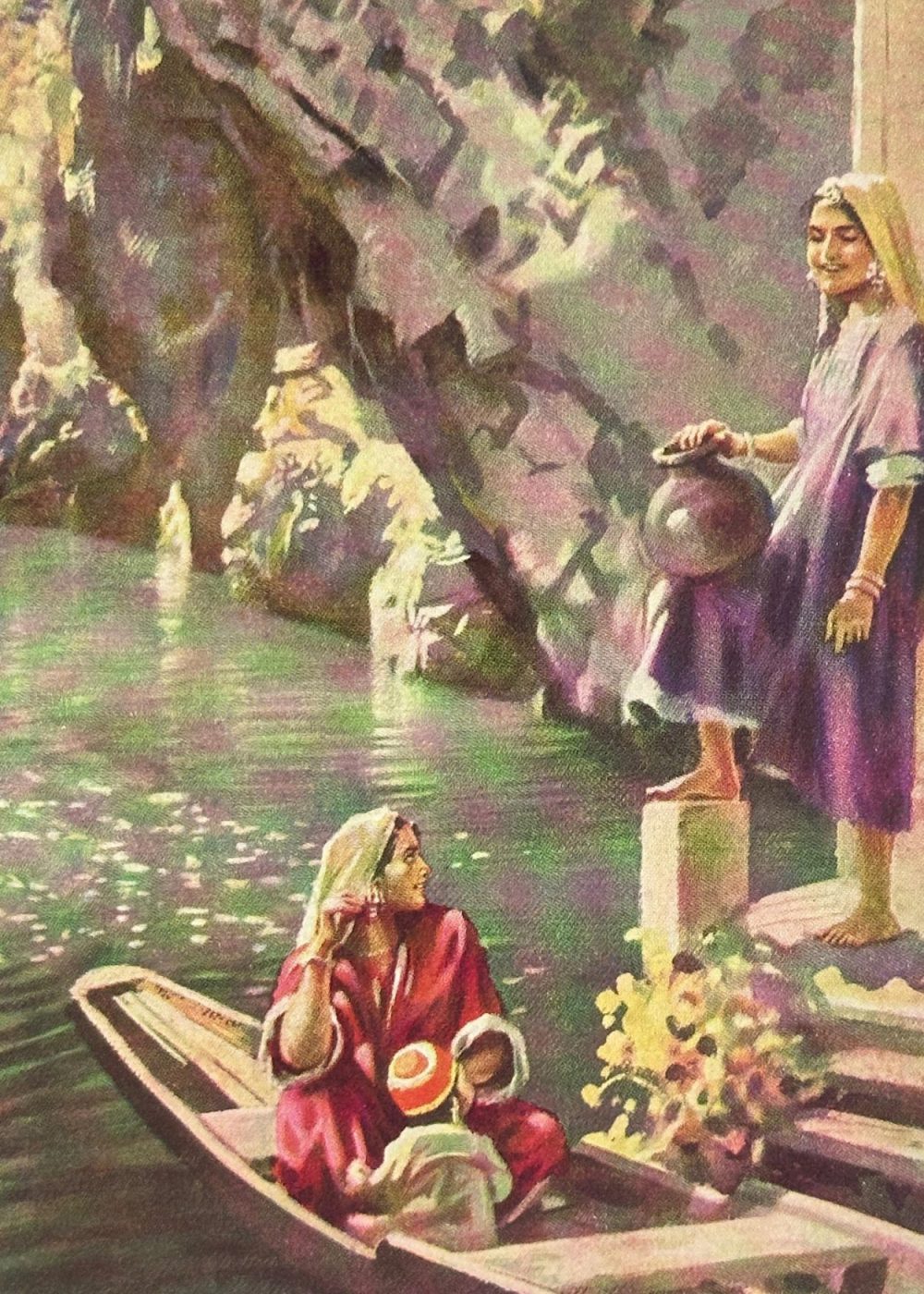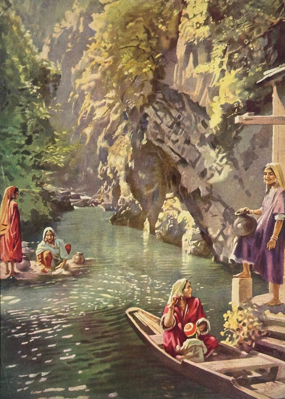 This evocative print captures a tranquil riverside scene nestled within a mountainous Indian landscape. Women, dressed in traditional attire, are depicted engaging in everyday activities—drawing water, washing clothes, and conversing—along the banks of a gently flowing river. One woman is seated in a wooden boat, holding a child, adding a tender domestic note to the composition. The surrounding cliffs and cascading foliage create a dramatic natural backdrop, rendered in soft, atmospheric tones.