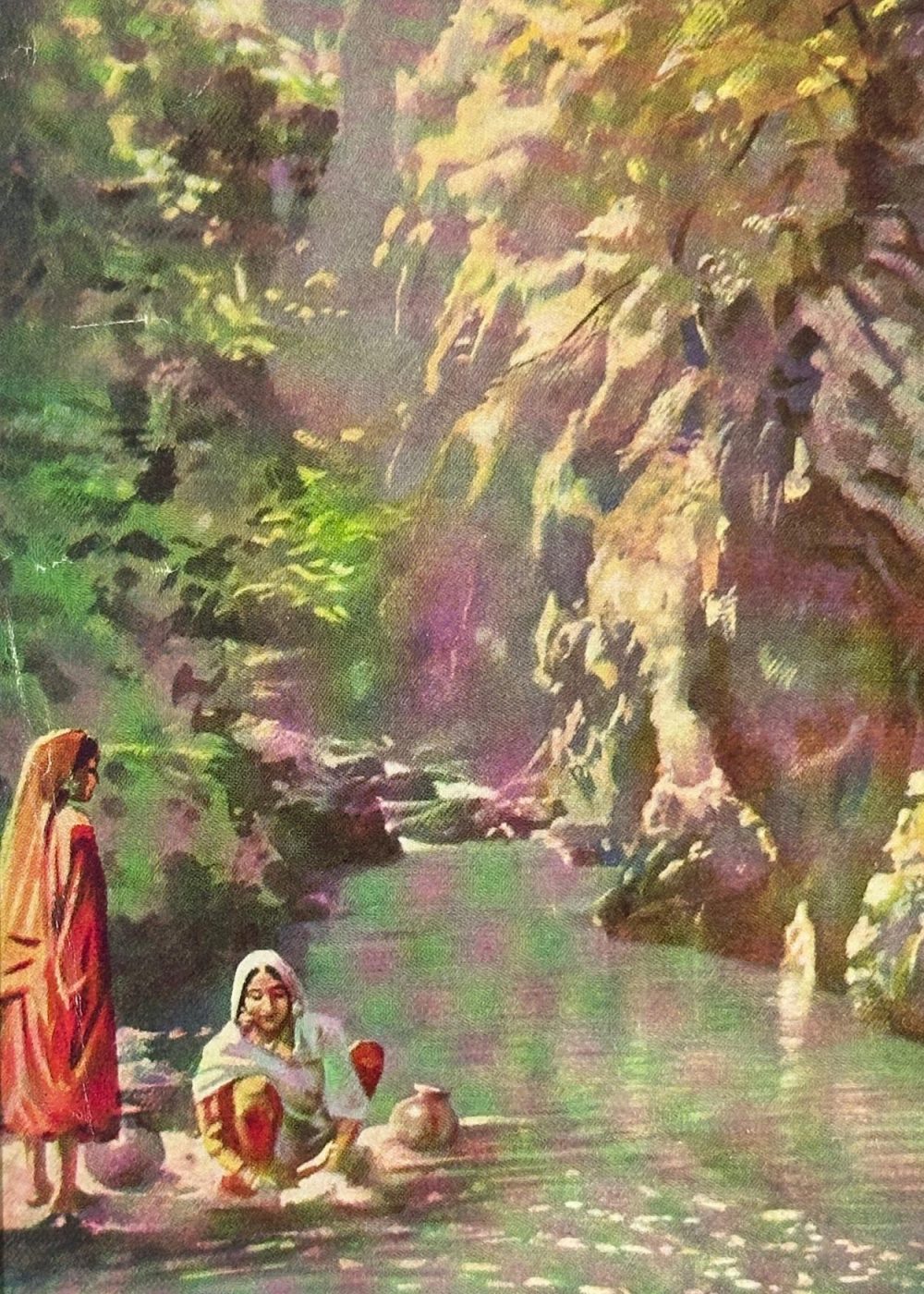 Likely produced for popular circulation during the early 20th century, the image reflects a romanticized yet respectful portrayal of rural Indian life. The work offers insights into the intersection of gender, labor, and landscape, and serves as a visual document of cultural and environmental harmony in a pre-industrial setting.