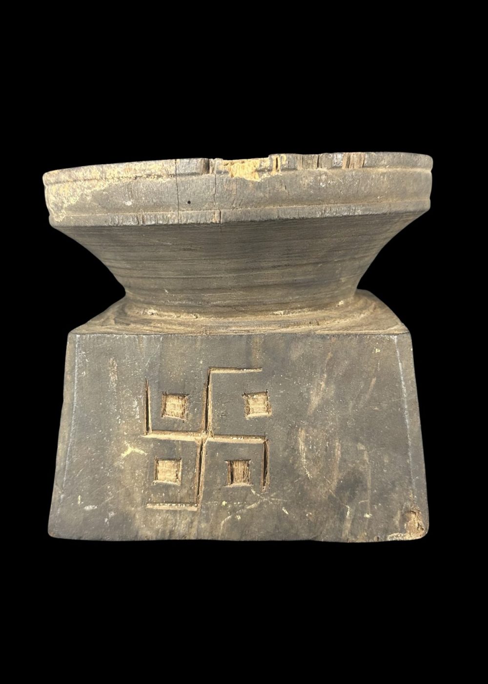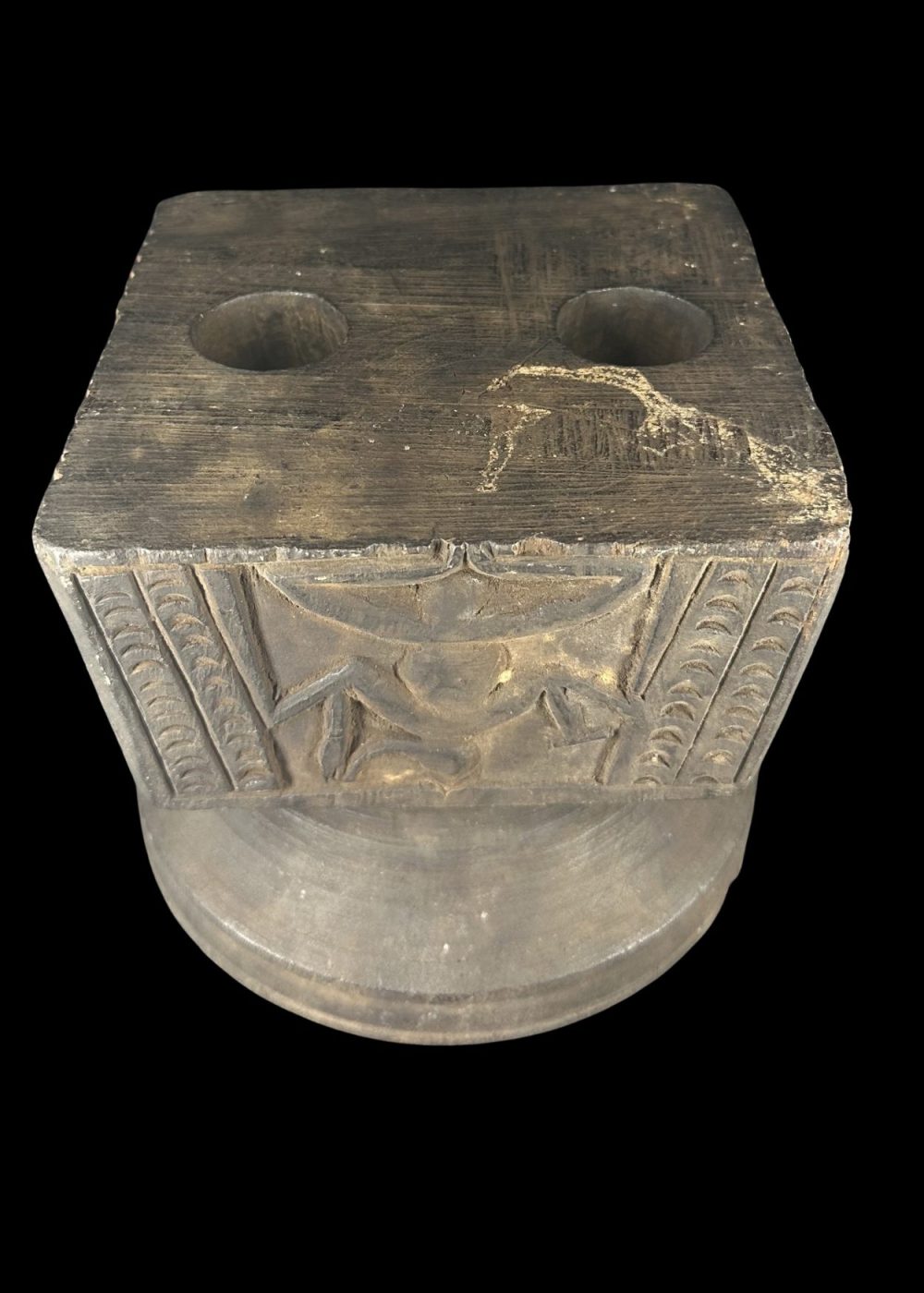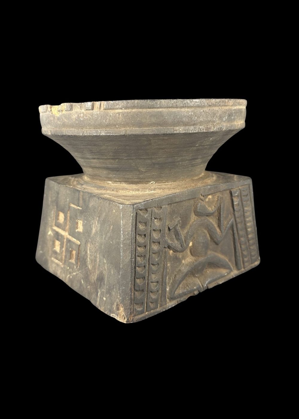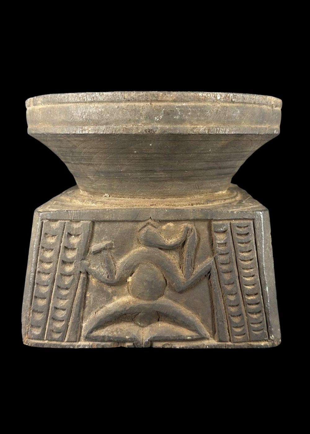 This wooden pedestal features a tapering circular top above a square base adorned with a stylized human or divine figure in a dynamic posture, possibly representing a guardian or spirit. The flanking linear motifs may symbolize foliage or protective elements. Such pedestals were likely used in ritual contexts, either to support sacred objects or offerings in village shrines. The minimalist carving style and symbolic representation reflect tribal or folk artistic traditions deeply rooted in ancestral worship and animistic beliefs. Period 18th–19th century. Place Eastern India