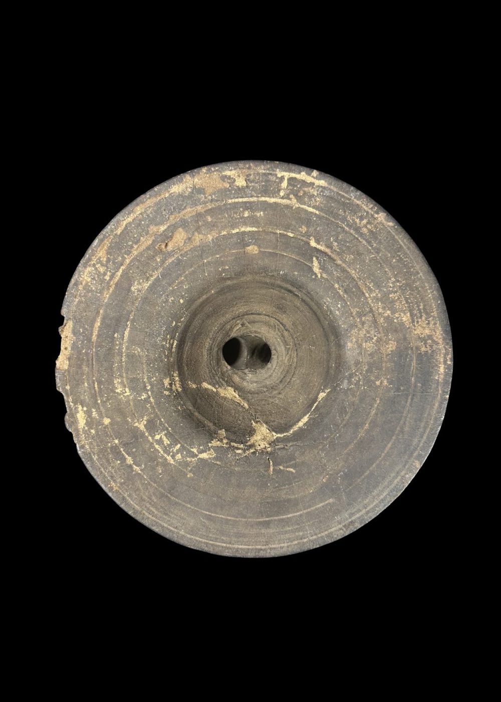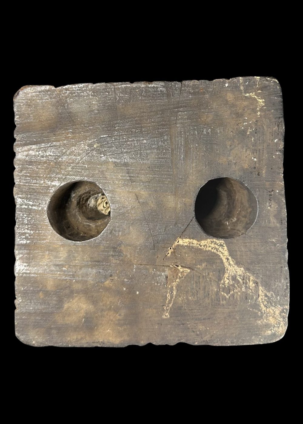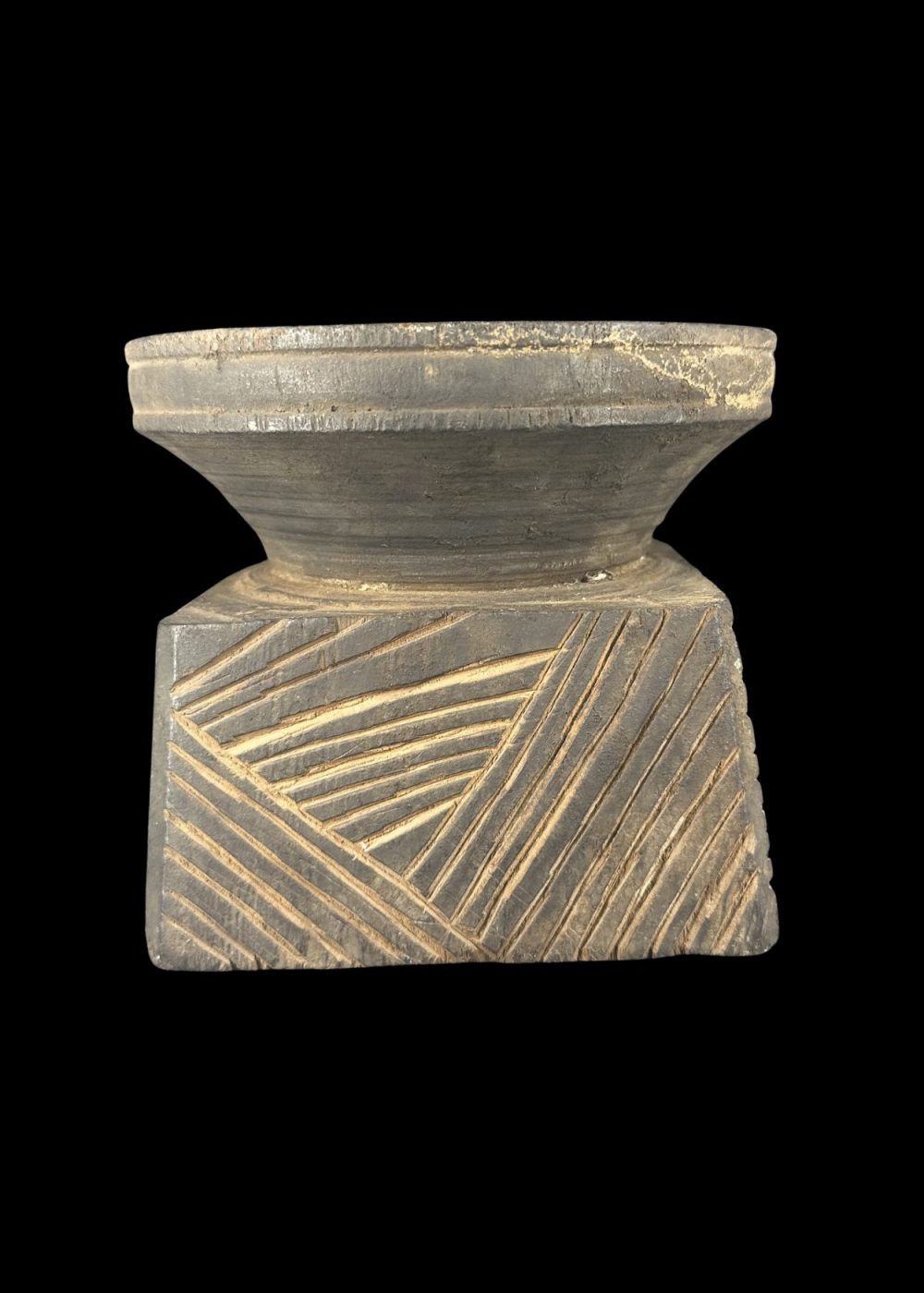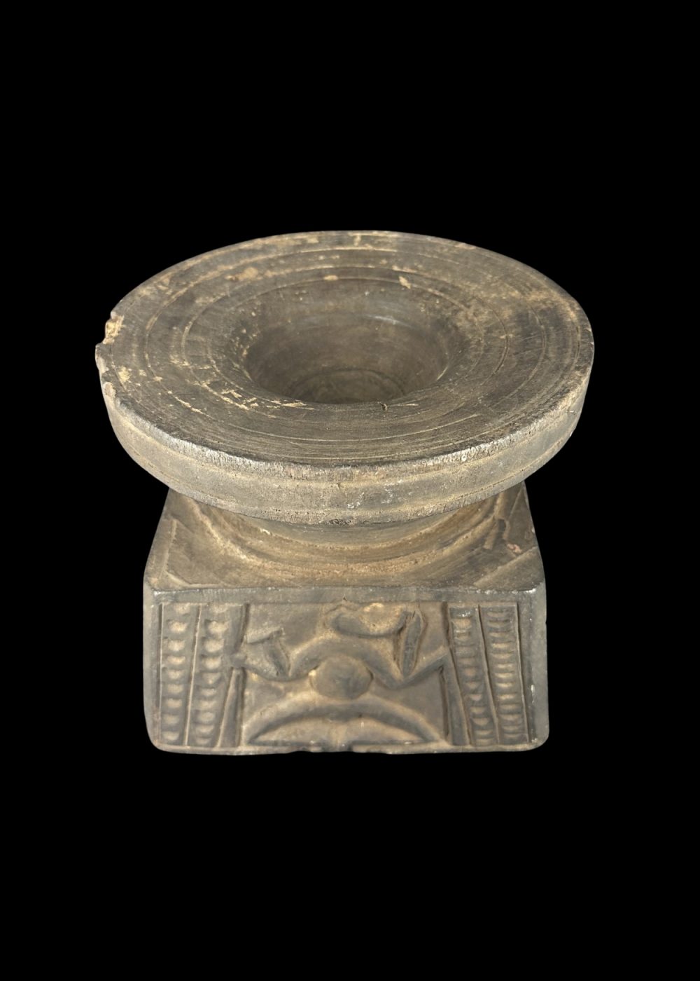 This wooden pedestal features a tapering circular top above a square base adorned with a stylized human or divine figure in a dynamic posture, possibly representing a guardian or spirit. The flanking linear motifs may symbolize foliage or protective elements. Such pedestals were likely used in ritual contexts, either to support sacred objects or offerings in village shrines. The minimalist carving style and symbolic representation reflect tribal or folk artistic traditions deeply rooted in ancestral worship and animistic beliefs. Period 18th–19th century. Place Eastern India