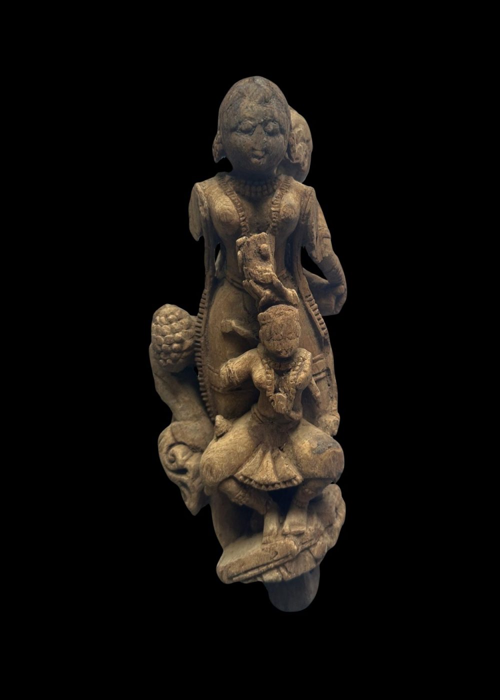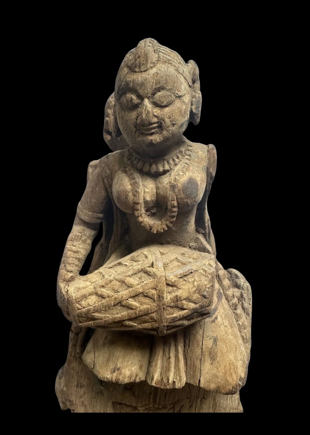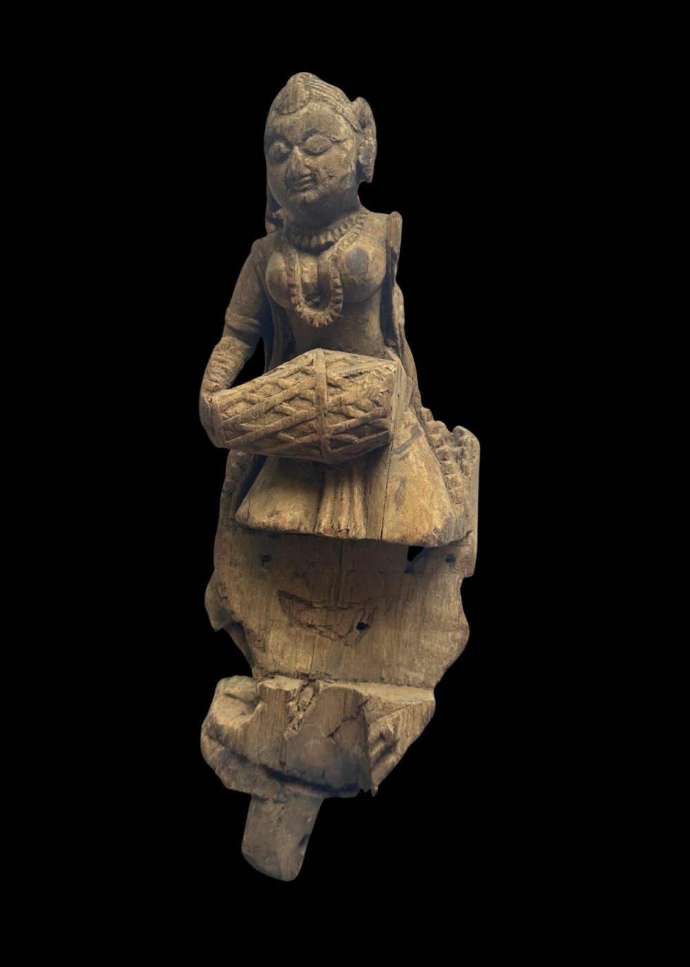 This carved wooden figure, originating from a historic structure in Gujarat known as “Wood Place,” exemplifies the region’s celebrated woodcraft heritage. Depicting a figure clutching a drum-like instrument, the sculpture reveals fine detailing in attire and texture, echoing motifs rooted in local architectural traditions. The piece reflects Gujarat’s enduring emphasis on rhythmic form and ornamental design, capturing the spirit of devotional and celebratory themes in domestic and ceremonial settings.