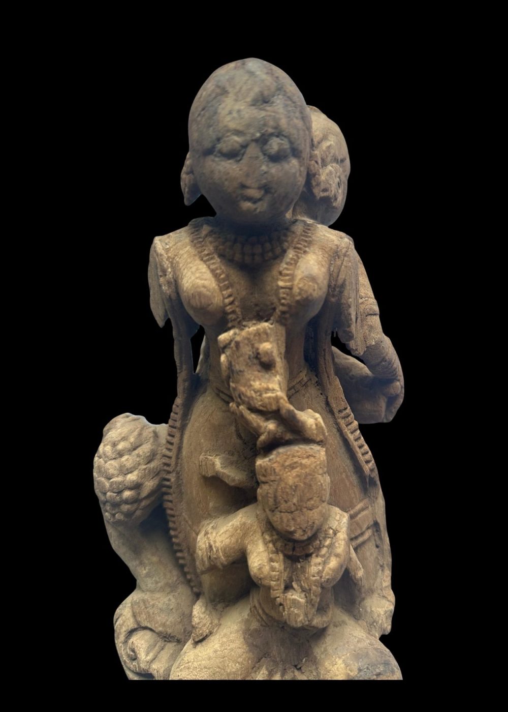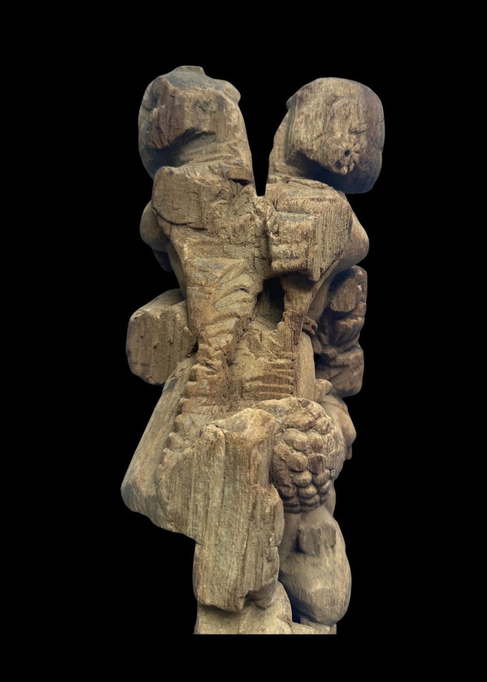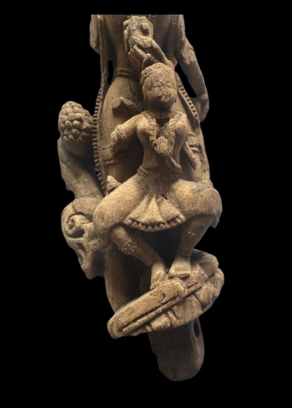 This carved wooden figure, originating from a historic structure in Gujarat known as “Wood Place,” exemplifies the region’s celebrated woodcraft heritage. Depicting a figure clutching a drum-like instrument, the sculpture reveals fine detailing in attire and texture, echoing motifs rooted in local architectural traditions. The piece reflects Gujarat’s enduring emphasis on rhythmic form and ornamental design, capturing the spirit of devotional and celebratory themes in domestic and ceremonial settings.