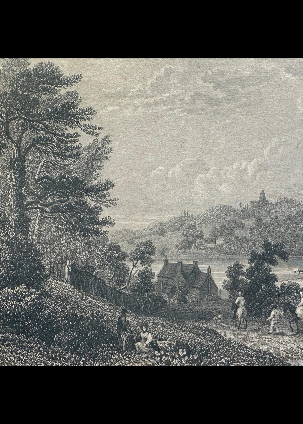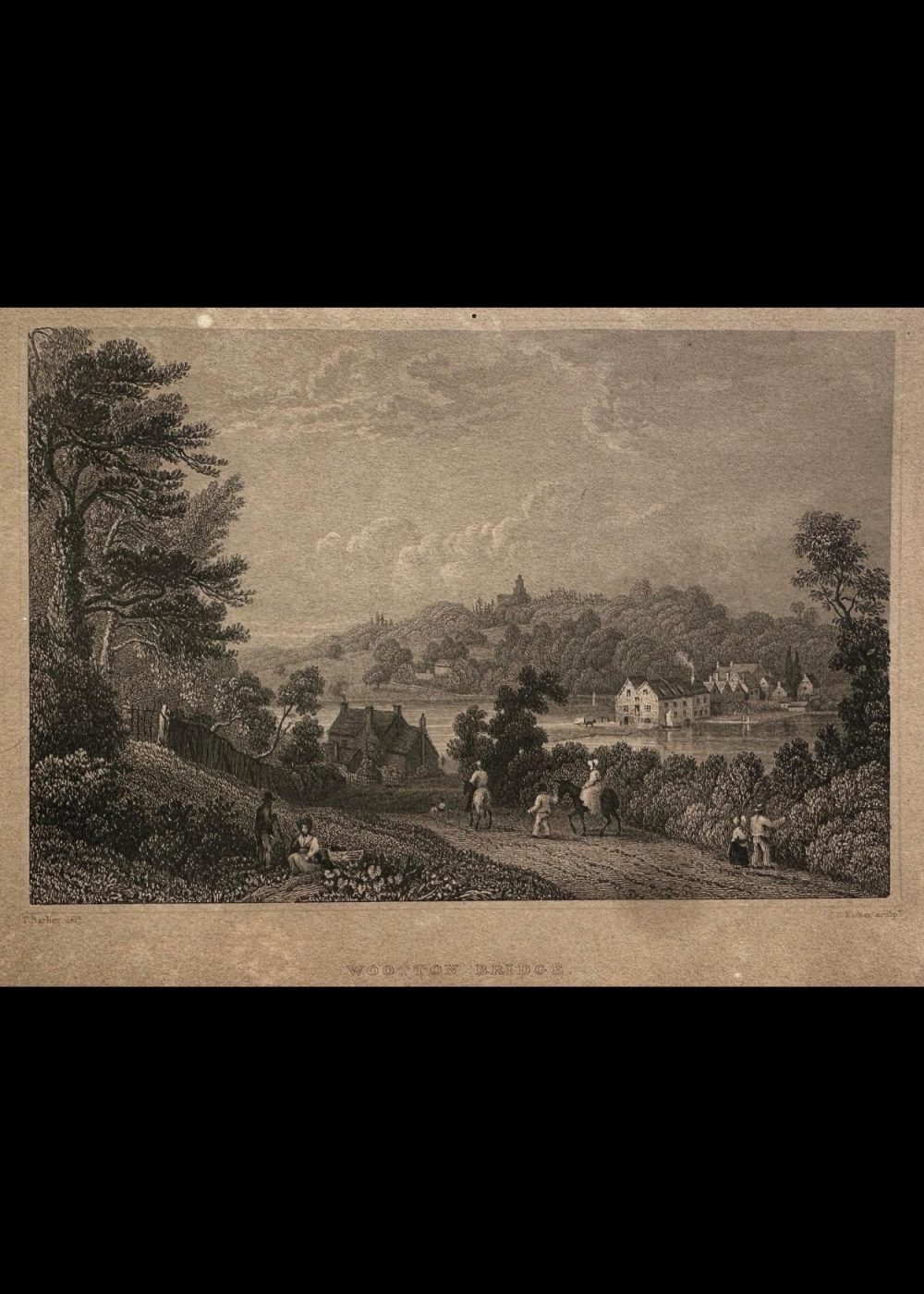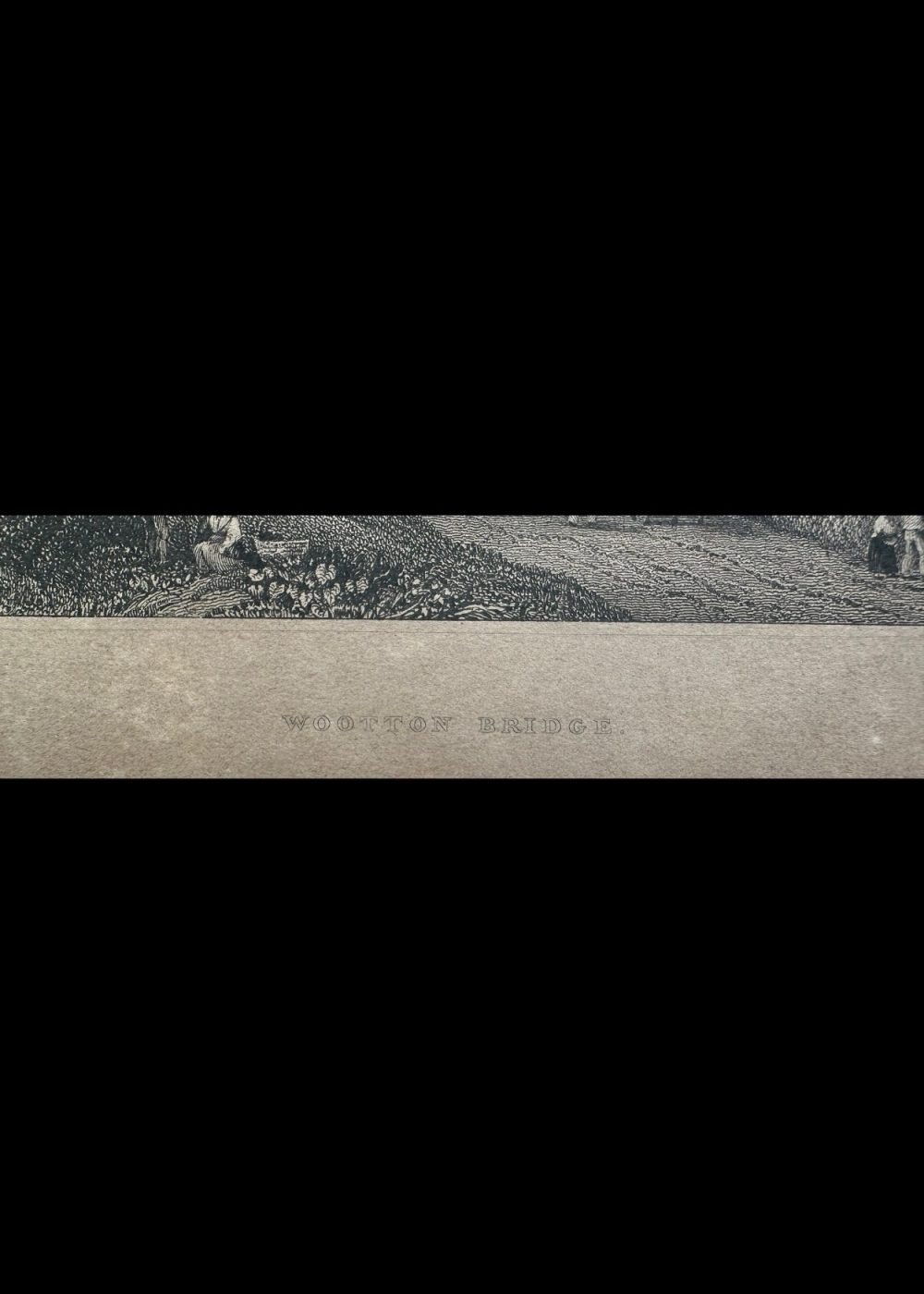 This finely detailed engraving titled “Wootton Bridge” presents a serene pastoral scene in the countryside, centered on the rural charm of Wootton on the Isle of Wight. In the foreground, country folk are depicted engaging in daily life—children play, a couple strolls, and riders travel along a winding path that leads gently downhill. Nearby, two women rest among flowering plants, suggesting a moment of calm within the bucolic setting. Trees and hedgerows border the track, offering texture and framing the view naturally. Across the river in the middle distance stands the namesake Wootton Bridge, with its elegant span crossing calm waters. On the far bank, a small cluster of buildings—cottages and mills—nestle among dense woodland, their reflections shimmering on the surface of the river. The composition draws the eye upward to the distant hills, where a small tower or ruin emerges from the tree-covered heights, completing the scene with a sense of historic depth and quiet majesty. Rendered in soft tonal gradations, the image captures both the physical beauty and the tranquil rhythm of rural life in 19th-century England.