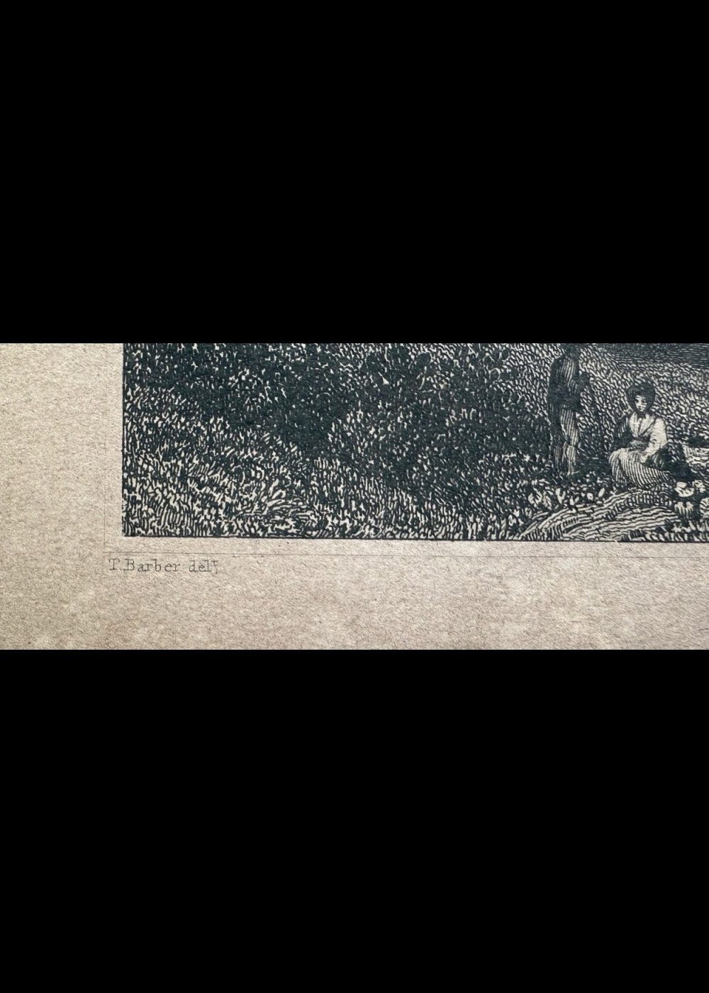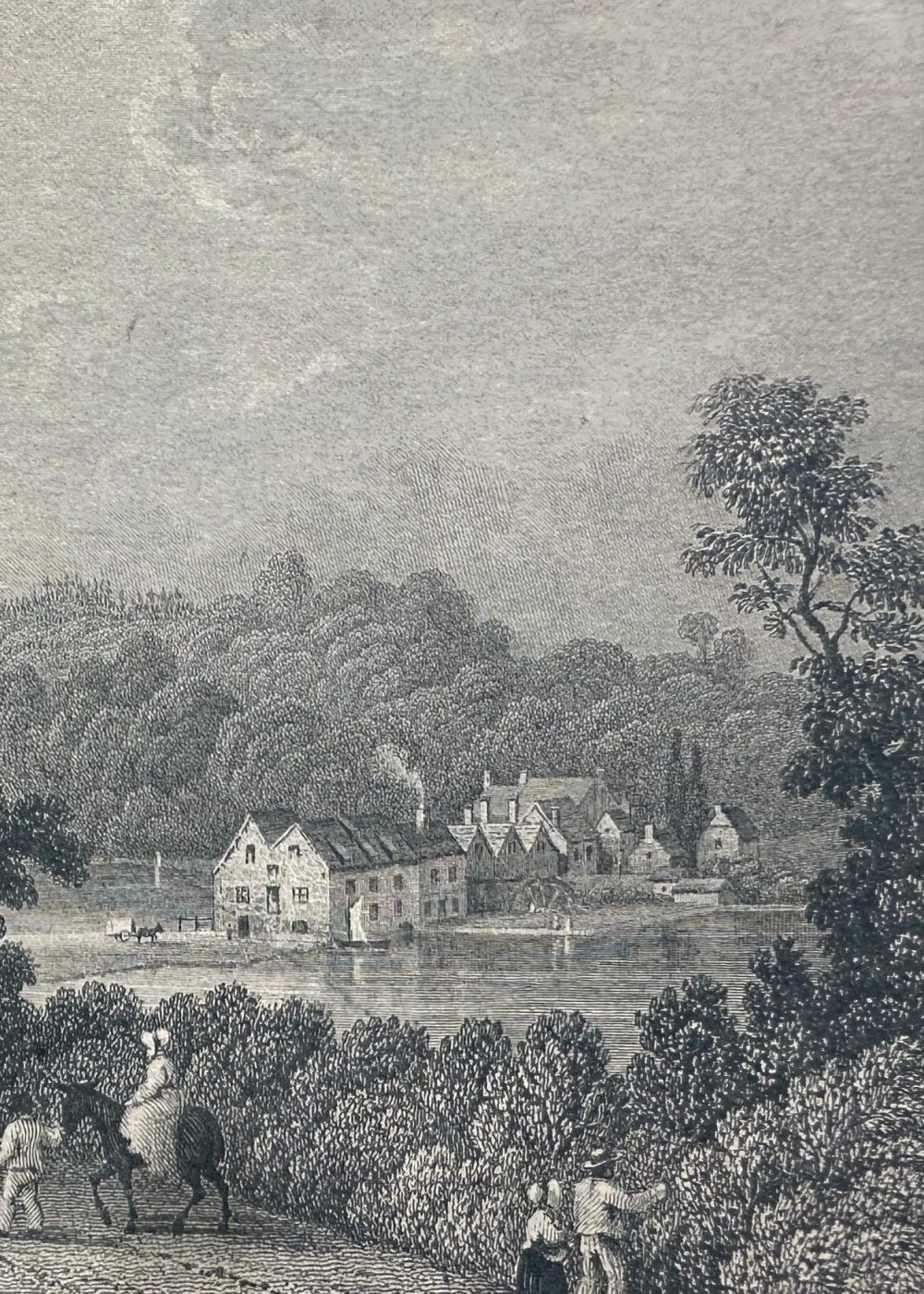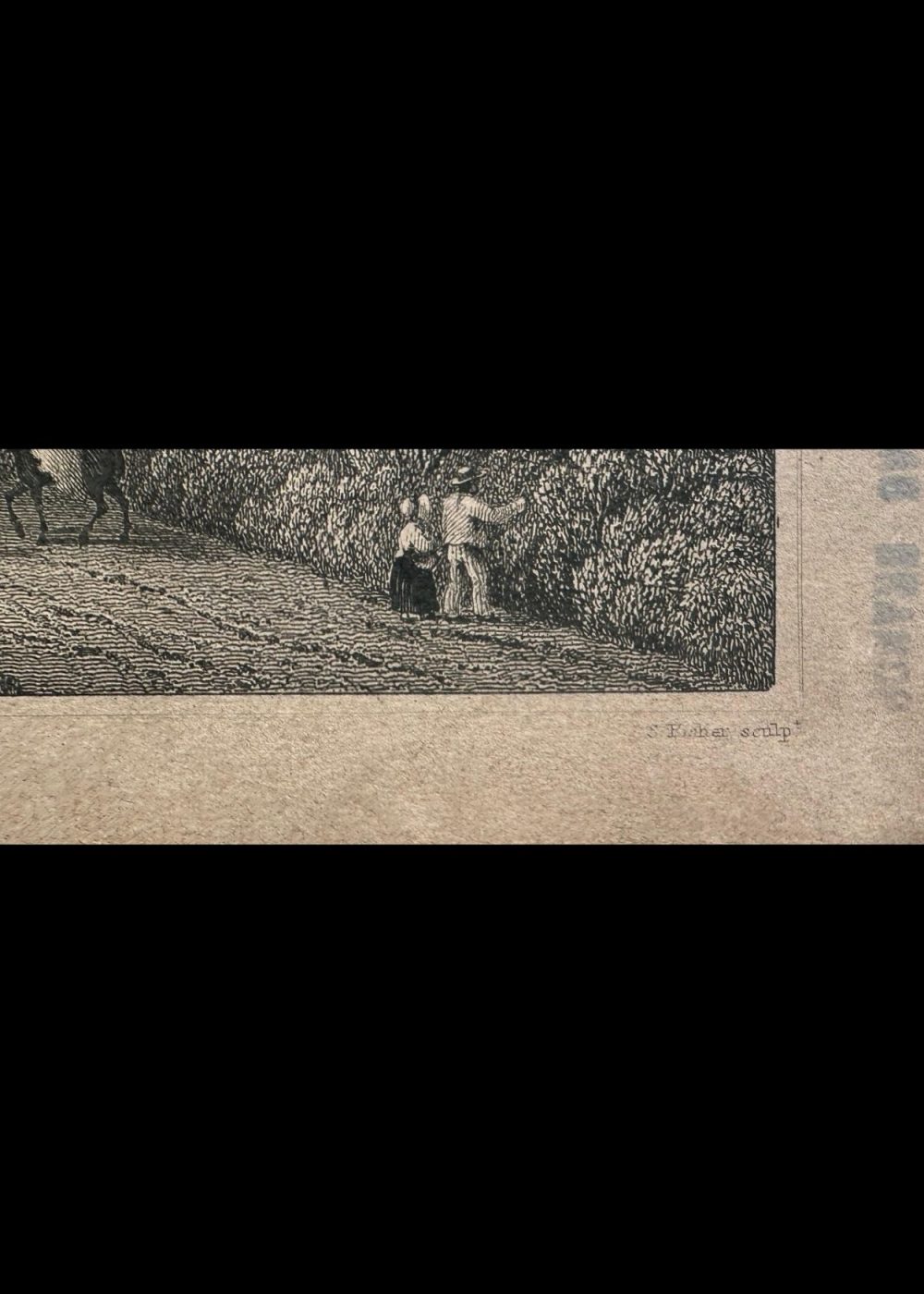 This finely detailed engraving titled “Wootton Bridge” presents a serene pastoral scene in the countryside, centered on the rural charm of Wootton on the Isle of Wight. In the foreground, country folk are depicted engaging in daily life—children play, a couple strolls, and riders travel along a winding path that leads gently downhill. Nearby, two women rest among flowering plants, suggesting a moment of calm within the bucolic setting. Trees and hedgerows border the track, offering texture and framing the view naturally. Across the river in the middle distance stands the namesake Wootton Bridge, with its elegant span crossing calm waters. On the far bank, a small cluster of buildings—cottages and mills—nestle among dense woodland, their reflections shimmering on the surface of the river. The composition draws the eye upward to the distant hills, where a small tower or ruin emerges from the tree-covered heights, completing the scene with a sense of historic depth and quiet majesty. Rendered in soft tonal gradations, the image captures both the physical beauty and the tranquil rhythm of rural life in 19th-century England.