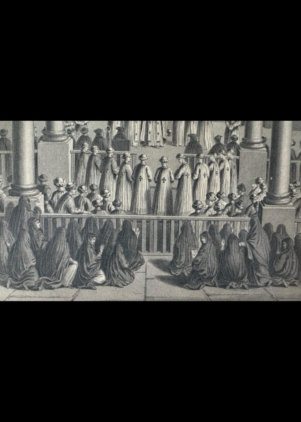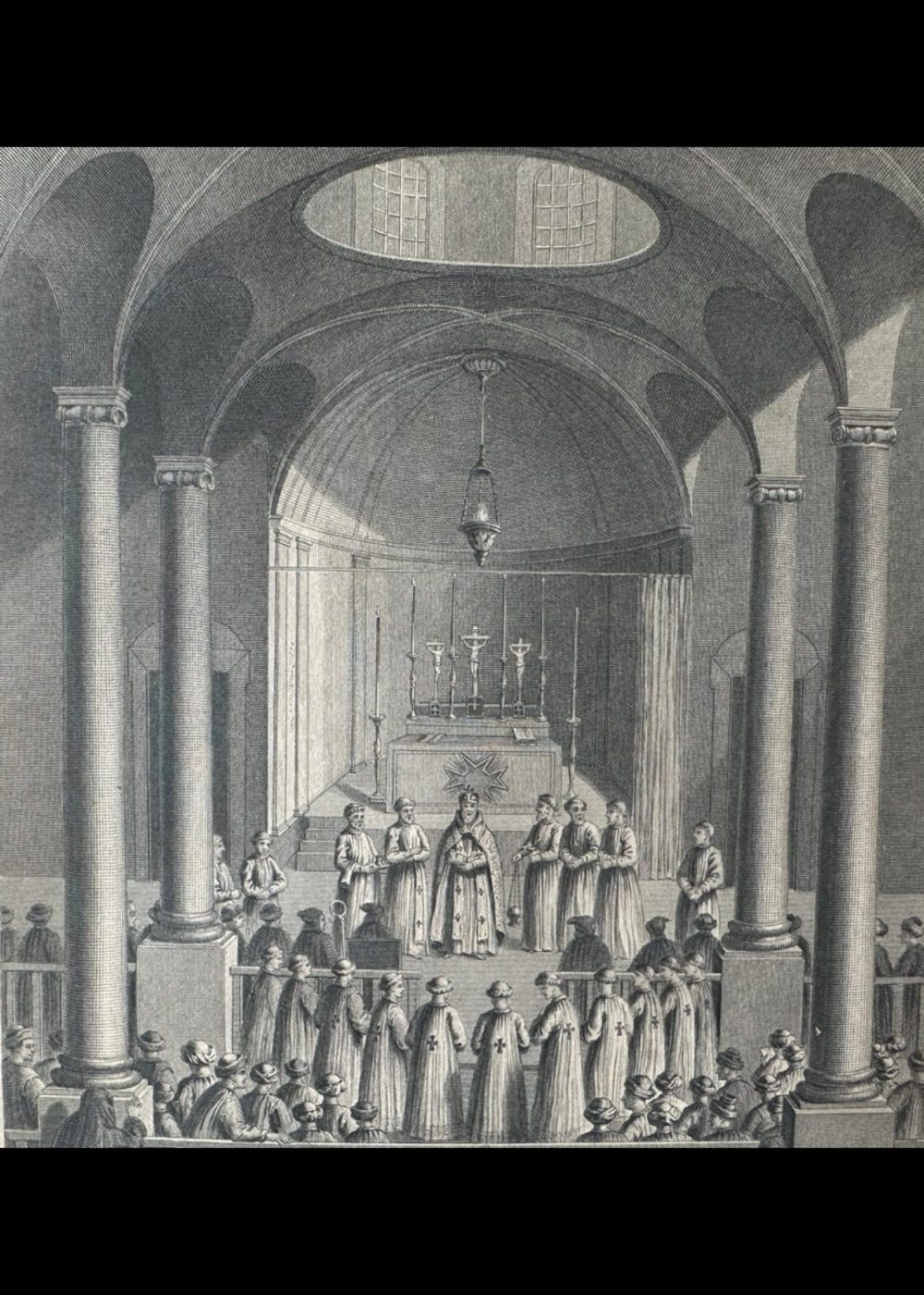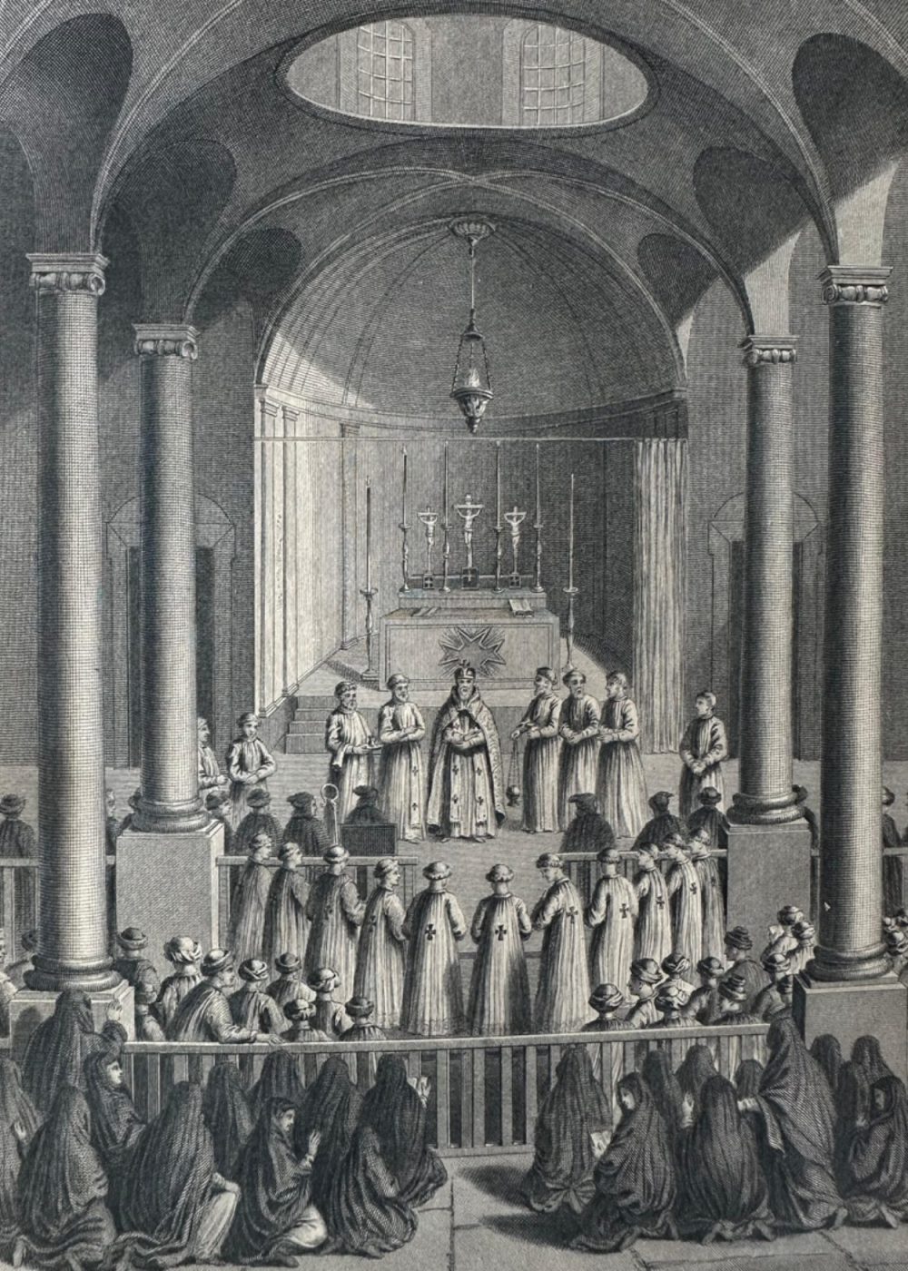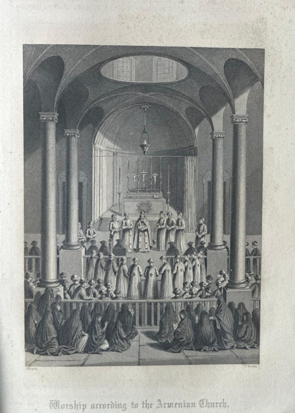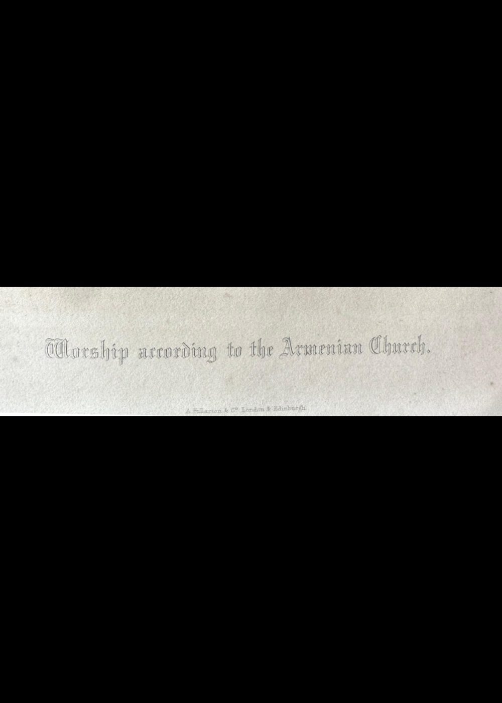 “THE FAITHS IN THE WORLD”. A dictionary of all religions and their religious sects. by The Rev. James Gardner. This detailed 19th-century engraving depicts a solemn religious service within the Armenian Church. The scene captures a richly adorned clergy conducting liturgy at the altar, which is set beneath an arched apse and illuminated by hanging lamps. The priests and acolytes, dressed in traditional robes, are surrounded by worshippers—men standing in the middle, and women, veiled and seated, in the foreground. The architectural setting, with its vaulted ceilings and columns, reflects the classical church design. The image offers a reverent glimpse into the ceremonial and hierarchical aspects of Armenian Christian worship.