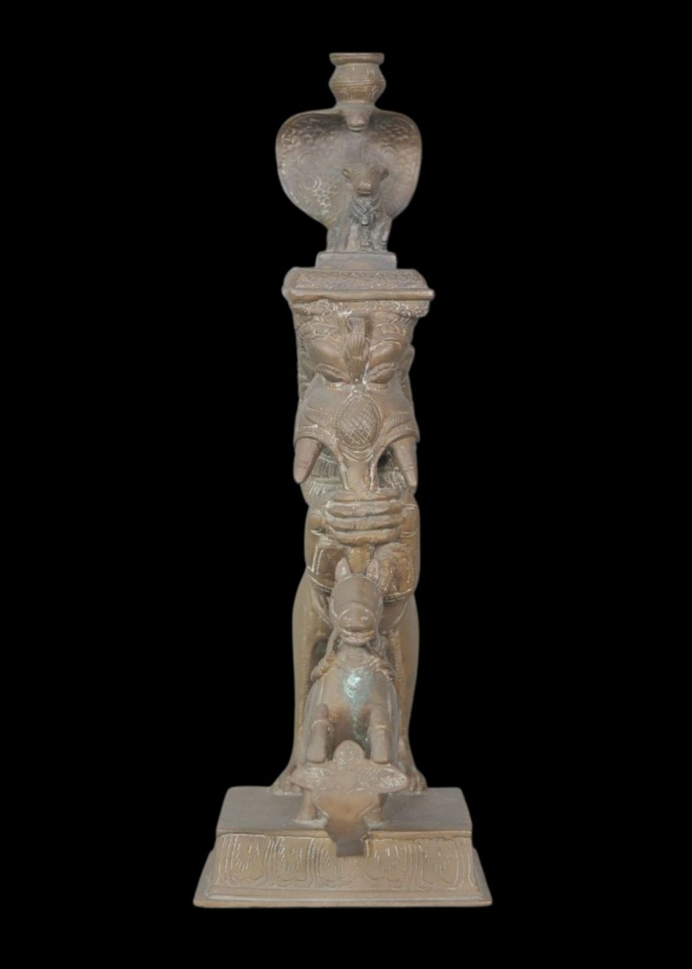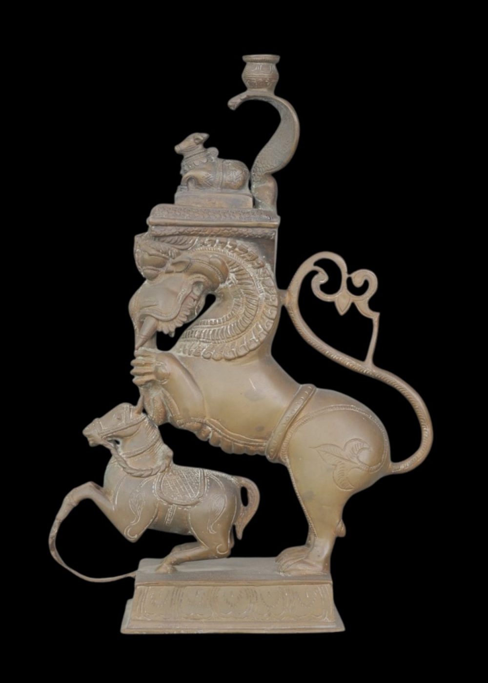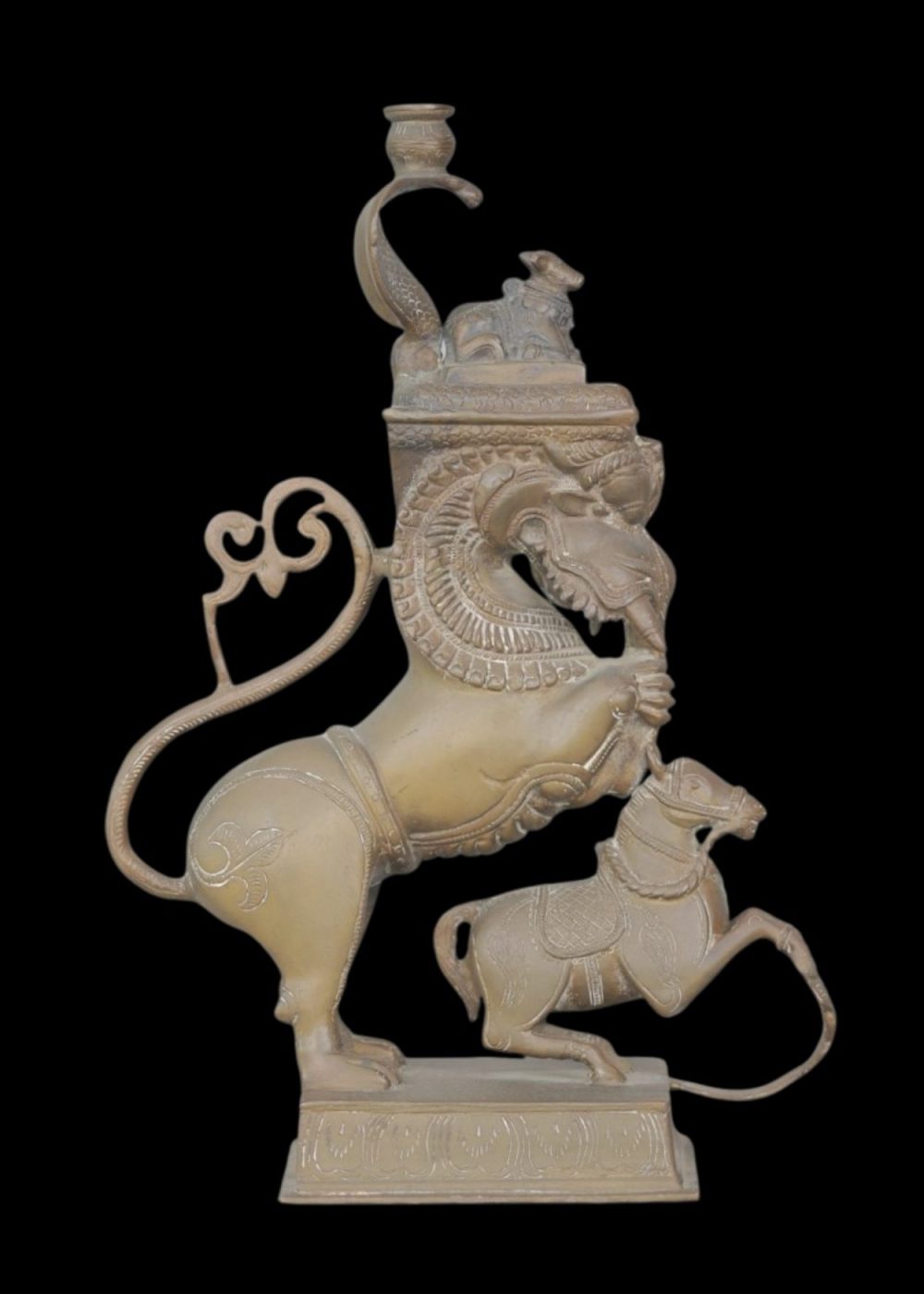 This striking bronze sculpture depicts a yali—a mythic guardian beast with leonine posture and elephantine trunk—rendered in high relief atop a rectangular pedestal. Beneath the yali’s poised stance stands a bridled horse figure, emphasizing motion and subjugation within a symbolic hierarchy. The creature’s body is adorned with ornate collars and deeply incised detailing, culminating in a domed finial that features a seated feline figure beneath an arch resembling a cobra’s hood. Stylized scrollwork and formal symmetry highlight Tamil Nadu’s enduring tradition of devotional metalwork, where fierce iconography and layered motifs served protective and ceremonial roles in temple settings.