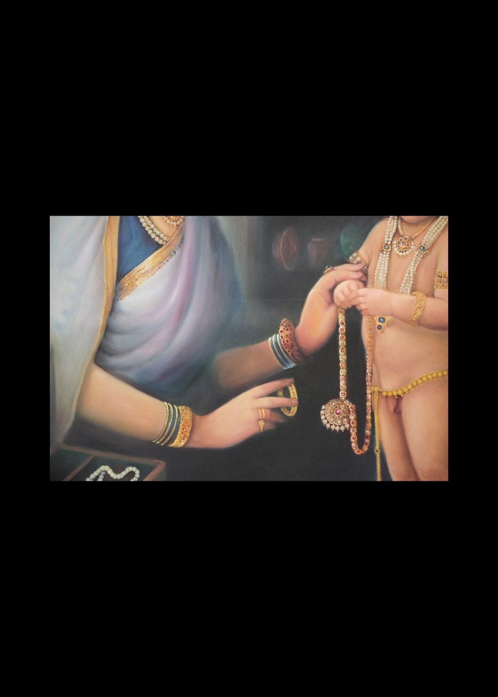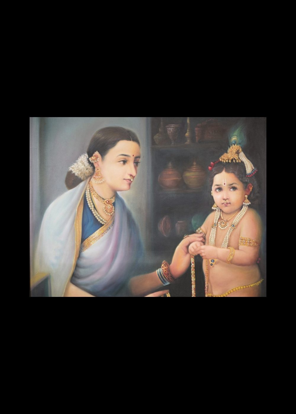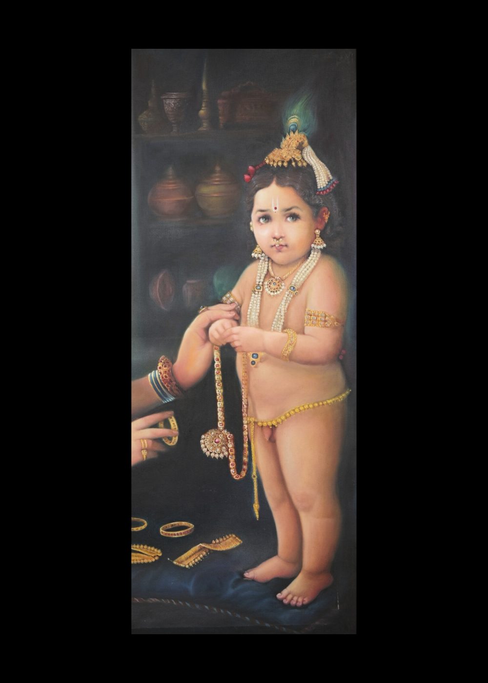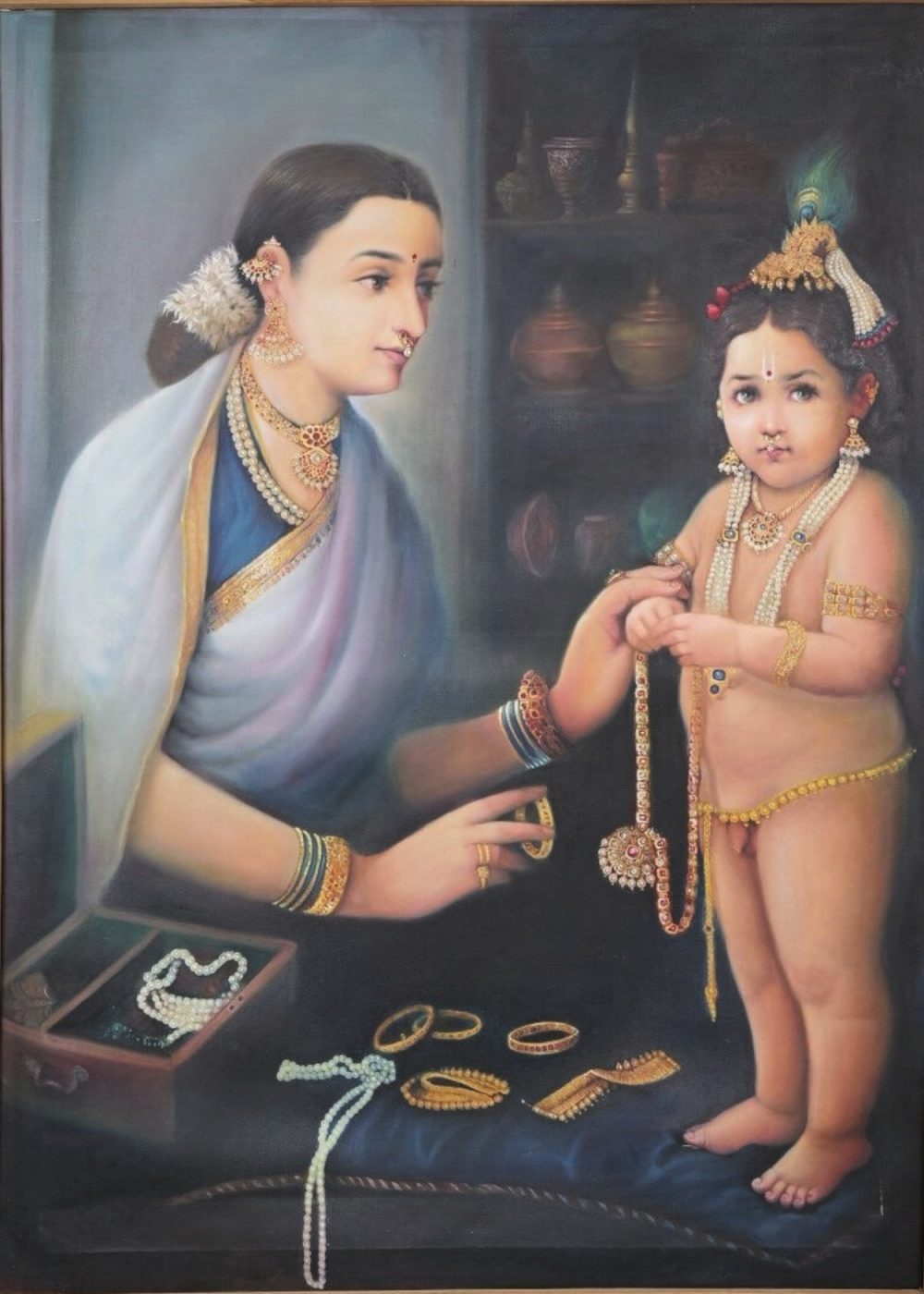 This devotional painting beautifully captures a tender moment between Yashoda and the child Krishna. Seated with a jewelry box open before her, Yashoda lovingly adorns the divine child with ornaments, while little Krishna, standing on a table, looks playfully composed. The setting, rich with traditional elements and muted tones, evokes the warmth of maternal affection and the sacred bond shared between mother and child. The depiction draws inspiration from mythological themes, especially those popularized in Raja Ravi Varma’s school of art, blending realism with divine narrative charm.