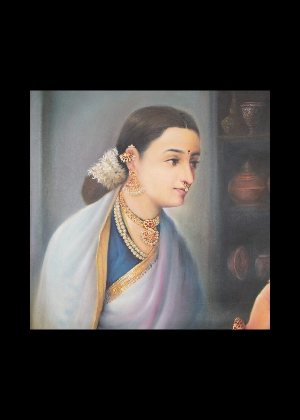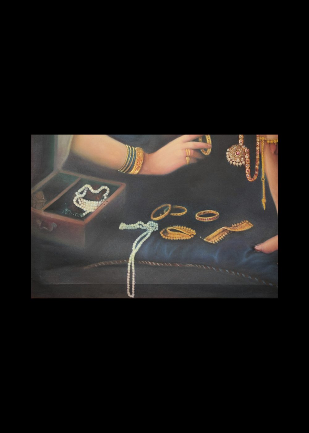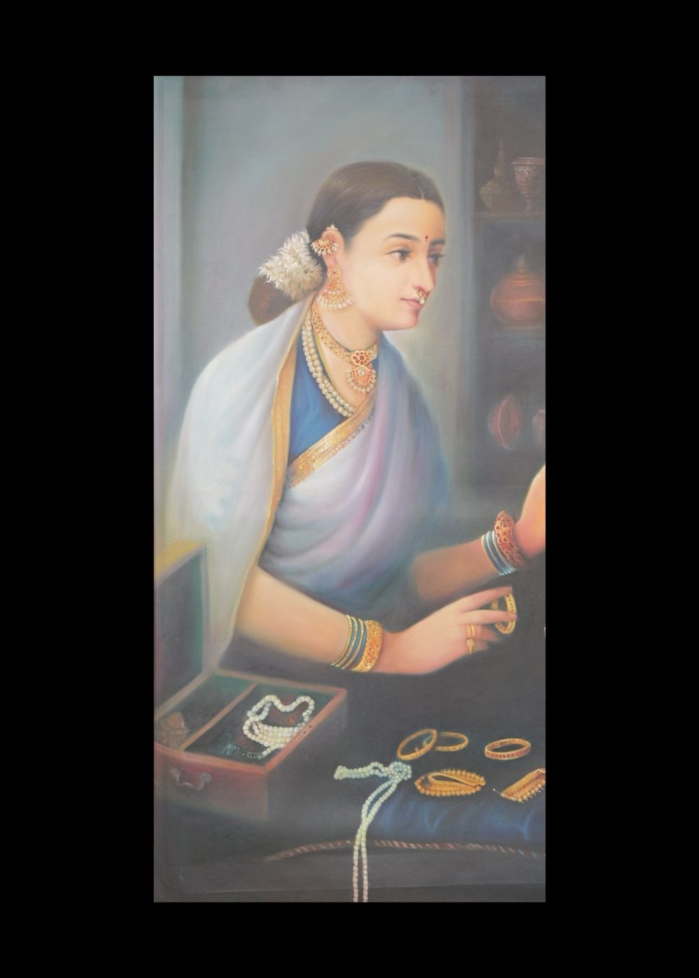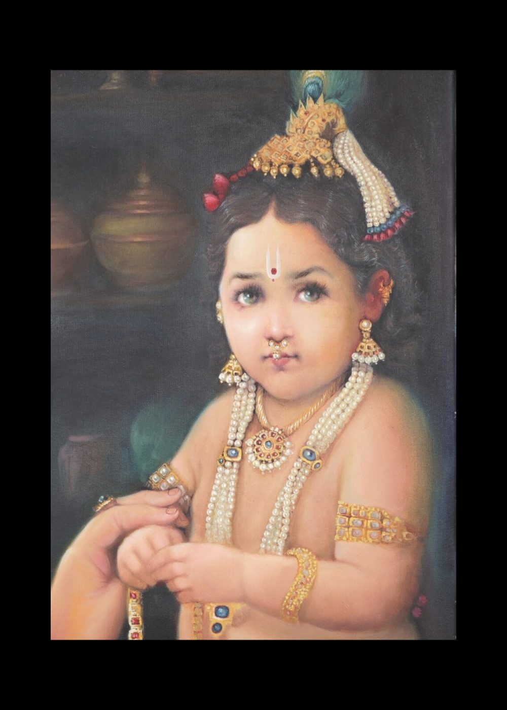 This devotional painting beautifully captures a tender moment between Yashoda and the child Krishna. Seated with a jewelry box open before her, Yashoda lovingly adorns the divine child with ornaments, while little Krishna, standing on a table, looks playfully composed. The setting, rich with traditional elements and muted tones, evokes the warmth of maternal affection and the sacred bond shared between mother and child. The depiction draws inspiration from mythological themes, especially those popularized in Raja Ravi Varma’s school of art, blending realism with divine narrative charm.