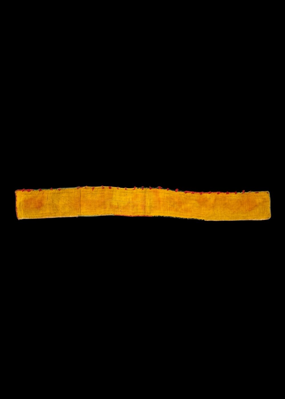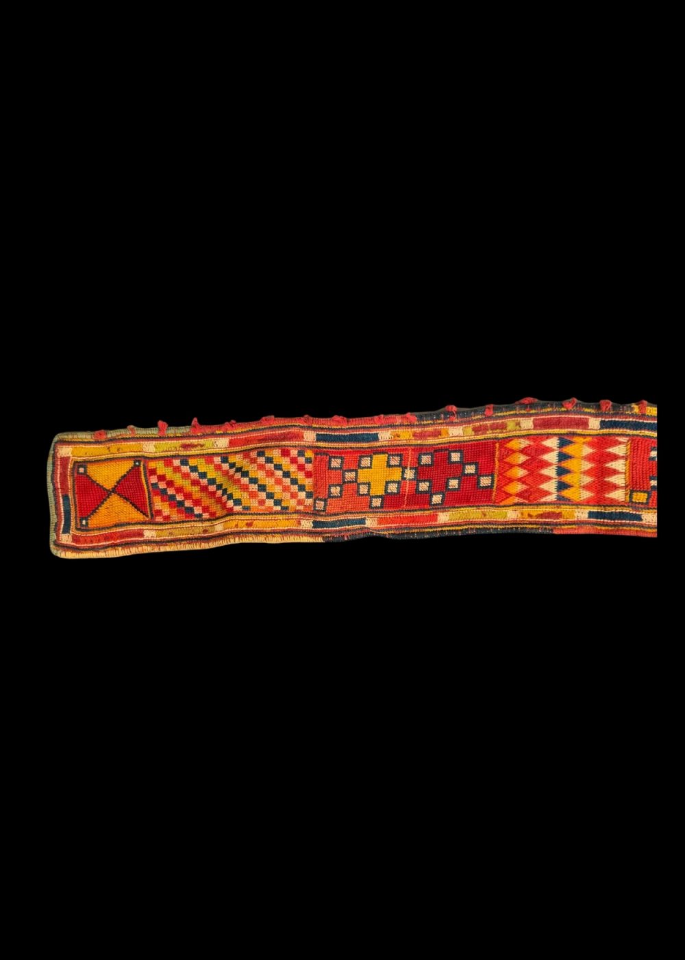 This is traditional Banjara embroidered belt, showcasing vibrant and intricate craftsmanship. The belt is adorned with bold geometric patterns in rich colors like red, yellow, black, and green. These eye-catching designs are typical of Banjara embroidery, reflecting the community’s deep cultural heritage and aesthetic values. The belt’s symmetrical motifs, such as diamonds, squares, and zigzag lines, are not just decorative but also carry symbolic meanings, often related to protection and prosperity. The vibrant thread work highlights the skill of the artisans and the significance of these traditional garments in Banjara culture.